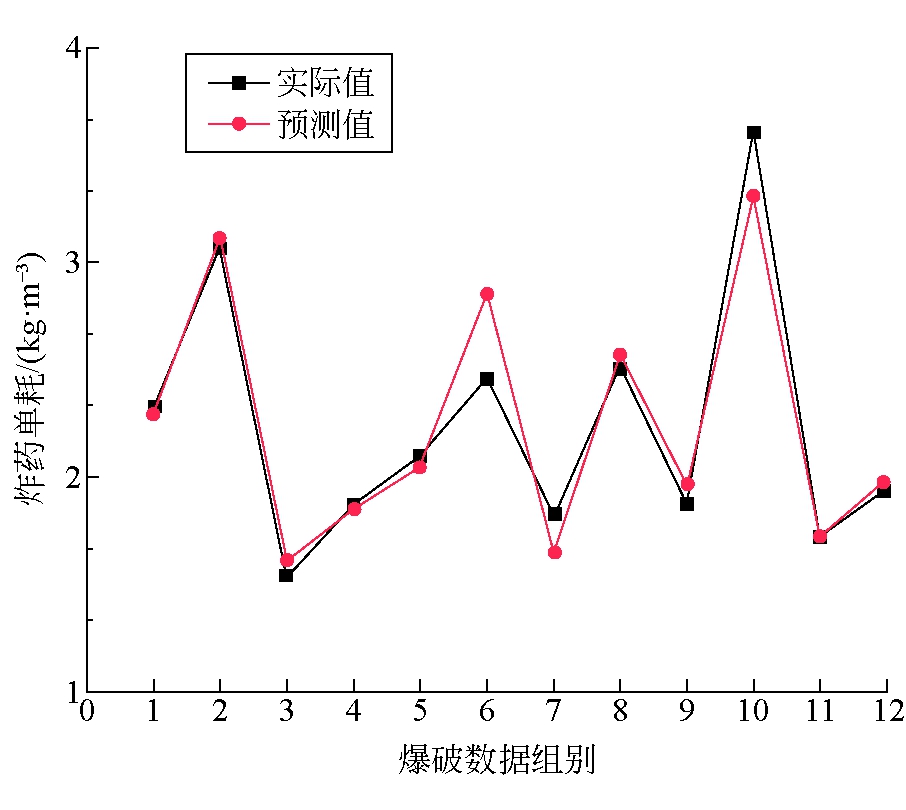注:Std.Dev为标准差 ;散点图中横线所包围的数据点为偏差小于1的数据点,即测装药量偏差小于0.2 kg/m3 4 工程应用为了测试基于SVM的煤矿岩巷爆破参数预测模型的效果,以安徽省淮北煤矿作为工程背景,现场收集了12组爆破数据进行上述技术的应用实践检验,见表4。 选择SSA优化算法得到的最优超参数c和gamma,利用上述确定的6个输入参数建立SVM预测模型,使用上述的训练集对模型进行训练,然后将实际工程中得到的12组爆破数据输入到该预测模型中对炸药单耗进行预测,得到的预测结果如图5所示。由图5可知,在实际工程得到了12组数据,SVM模型得到的炸药单耗预测值与实际值接近,模型准确率为92.3%。基于SVM的预测模型在经过SSA优化算法调参后在预测爆破参数方面表现出很好的效果。
