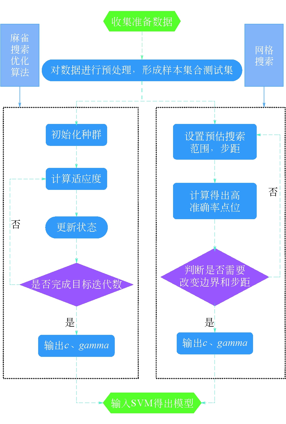 再引入拉格朗日乘数法即可对其求解。但在实际上很多数据往往是线性不可分的,需要对其使用核函数进行升维以找到一个超平面。根据周志华[11]的研究,如果特征的数量大到和样本数量差不多,则选用线性核的SVM;如果特征的数量小,样本的数量正常,则选用高斯核函数;如果特征的数量小,而样本的数量很大,则需要手工添加一些特征从而变成第一种情况。实际已有数据中爆破参数特征数量远小于样本数,由此可以选出高斯核函数(RBF)作为实验用核函数。 2 SVM超参数优化方案基于高斯核函数对于核函数参数选择十分敏感,为了取得适应度更佳的模型,需要对其参数(c,gamma)进行优化调整。c为惩罚系数,即为对于误差的宽容度;gamma为影响参数,定义了单个样本对于整个超平面的影响大小。笔者采用了目前主流的两种参数优化方式:网格搜索、群智能优化算法。 2.1 网格搜索(Grid Search)网格搜索方法即将待求参数视作高斯坐标轴,设定起点,终点,布局,以此来形成一张“网”,再以网格的数值代入核函数中,用其建立模型并计算出预测准确率,根据其得出的准确率结果。由准确率结果即可直观得出最优解数值,同时还可以对结果较为优异的区域进行放缩,以此来进一步提高准确率,但这一方法运用于数据量大的模型中往往需要较大的运算能力,并且部分计算机编程语言不能发挥出计算机全部的计算能力,会导致计算机运算速度过慢。所以选择适合的步距和范围,对于搜索区域进行一定次数的缩放可以减少运算时间,并且爆破数据量较小,这使得网格搜索十分适用于此类问题的SVM调参。 2.2 麻雀搜索优化算法(Sparrow Search Algorithm)不同的群智能优化算法基本上可分为两部分:使用随机算子对空间进行粗略的全局随机搜索;根据随机搜索的结果进行局部搜索找到全局最优解。这类寻优算法相较网格搜索运算点少,运算量低,只需要使用低于其数倍的时间就能得出相差不多甚至更佳的解。但其也具有随机性、结果不稳定的缺点。麻雀搜索优化算法是由薛建凯[12]在2020年提出的一种新型群智能优化算法,主要是受麻雀的觅食行为和反捕食行为的启发而提出的。使用数学模型来模拟麻雀种群在自然界中捕猎的行为,通过模拟麻雀的特性来捕捉全局最优解,寻优在这一过程可被看作麻雀通过叫声引导群体到达食物较多的地区,规避敌害,以此来找到食物最多的地区即全局最优解。 2.3 超参数优化过程将优化算法与SVM相结合,对c和gamma参数调优,以得出最佳的超参数数值,两种超参数优化算法流程如图1所示。 麻雀搜索优化算法主要步骤如下: (1)收集数据对样本数据进行预处理,进行归一化避免样本间的欧式距离度量不准,作为输入集; (2)初始化种群,迭代次数,初始化发现者和加入者数量比例; (3)计算初始种群适应度,并进行排序; (4)更新发现者、加入者以及意识到危险的麻雀位置,计算适应度,获得当前最优值; (5)如果未达到目标迭代次数则重复; (6)达到则输出c和gamma。