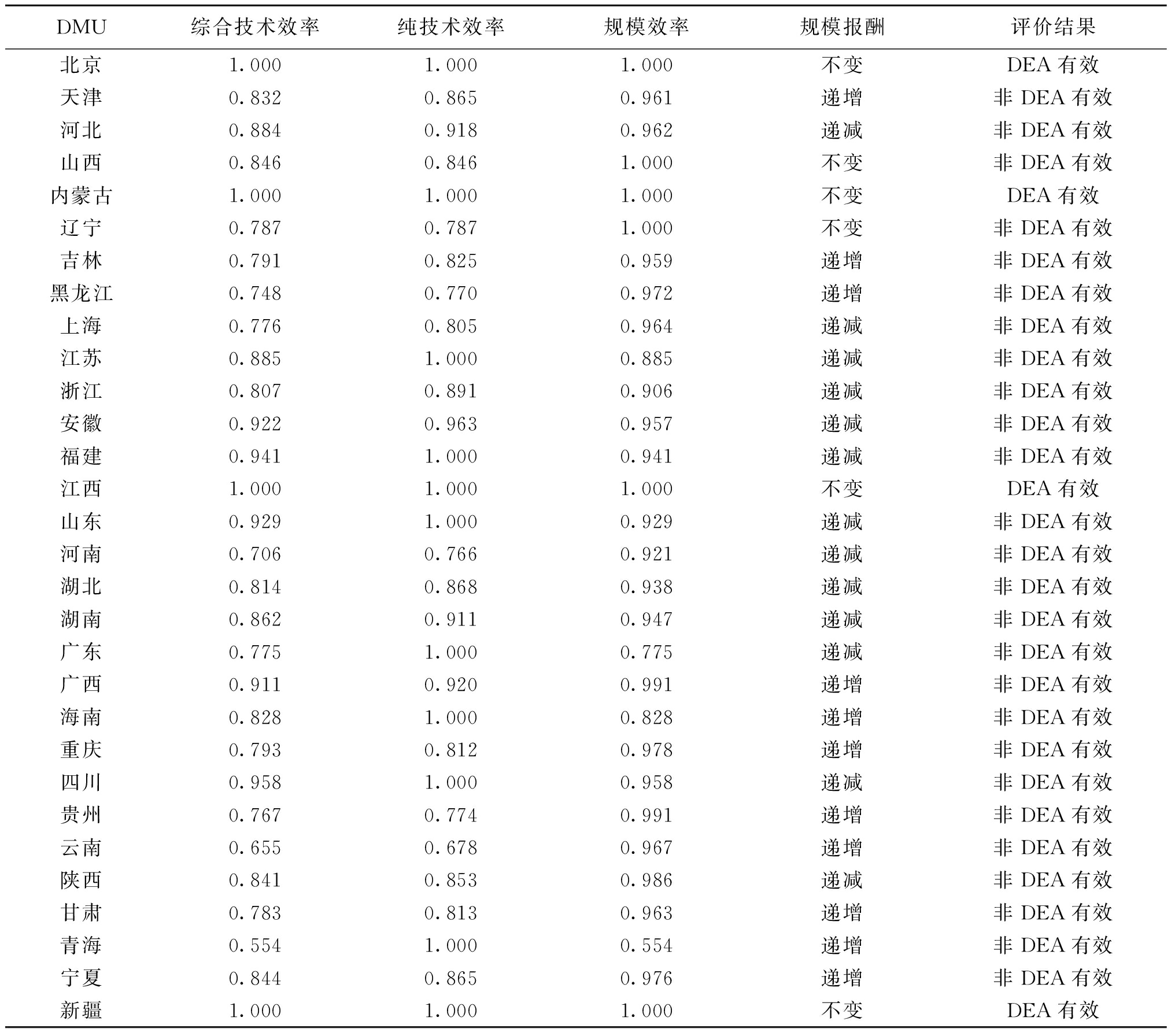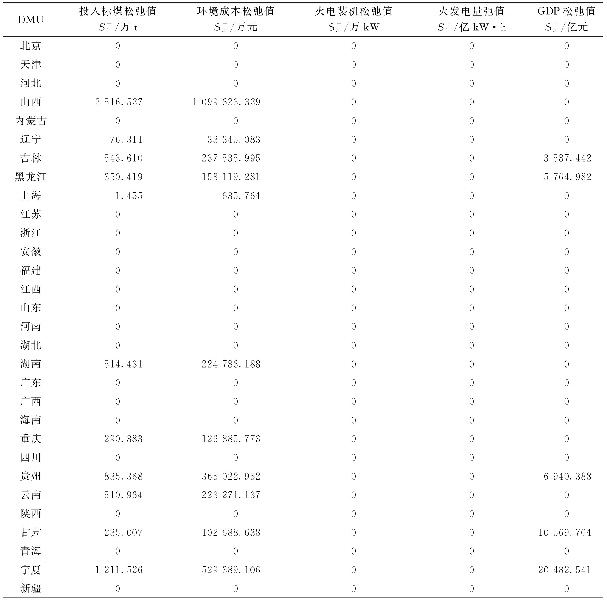 地区火力发电量/亿kW·hGDP/亿元投入标准煤/万t环境成本/万元火电装机/万kW北京43436 102.6012.145 306.056 3 1 136天津66814 083.731 391.46608 013.196 51 668河北2 35236 206.906 727.282 939 556.305 05 391山西2 92417 651.9310 351.644 523 258.825 06 878内蒙古4 73117 360.0019 353.968 456 917.974 09 374辽宁1 41025 115.004 794.382 094 955.161 03 643吉林72112 311.322 693.631 177 010.181 01 852黑龙江89513 698.503 166.491 383 631.370 02 423上海83538 700.581 791.46782 797.436 52 450江苏4 290102 719.0010 051.634 392 166.276 010 079浙江2 43264 613.005 597.972 446 092.330 06 358安徽2 53138 680.606 682.282 919 893.078 05 561福建1 55143 903.893 990.791 743 817.993 03 478江西1 19925 691.502 801.481 224 136.382 02 455山东5 11673 129.0013 315.275 818 248.368 011 135河南2 40054 997.076 623.702 894 295.926 07 068湖北1 24343 443.462 825.601 234 675.871 03 316湖南84941 781.491 917.18837 732.123 12 269广东3 425110 760.946 842.992 990 117.016 09 582广西1 03222 156.692 172.90949 471.687 72 344海南2155 532.39489.30213 804.821 6546重庆53825 002.791 293.60565 252.232 21 545四川51348 598.801 712.40748 251.331 41 596贵州1 35417 826.564 790.812 093 395.212 03 560云南41524 500.001 335.03583 355.509 81 517陕西2 08426 181.365 277.962 306 260.568 04 993甘肃9019 016.702 872.911 255 348.477 02 308青海1013 005.92267.86117 044.266 3393宁夏1 4153 920.554 759.382 079 661.540 03 326新疆3 19313 797.583 740.791 634 577.843 06 337 2 基于DEAP软件的省际火力能源效率分析借助DEAP软件纵向分析省际火力能源相关投入产出,并从效率和松弛变量两方面对绩效评价结果进行分析,得出火电能源效率情况。测算的相关指标结果值见表4,其中纯技术效率为1.000代表技术有效,表示该生产单元技术水平已达最优。规模效率为1.000代表规模有效,是指决策单元处于规模收益由递增到递减的交界处,投入产出为最优配置。综合效率为纯技术效率与规模效率的乘积,当纯技术和规模同时有效则DEA有效,即综合效率为1.000时决策单元到达生产前沿面。结果显示只有北京、内蒙古、江西和新疆为DEA有效。其余省(自治区、直辖市)火力发电的能源利用效率没用达到最优,其中各省的纯技术效率数值并不相同,有些省(自治区、直辖市)低至0.650,有的省(自治区、直辖市)高达0.990。规模收益分别有规模报酬递增、不变、递减3种状态。此结果说明了各省(自治区、直辖市)的火电能源经济系统的效率未到最优的原因各不相同,后续进一步讨论分析。 表4 2020年我国省际能源利用效率