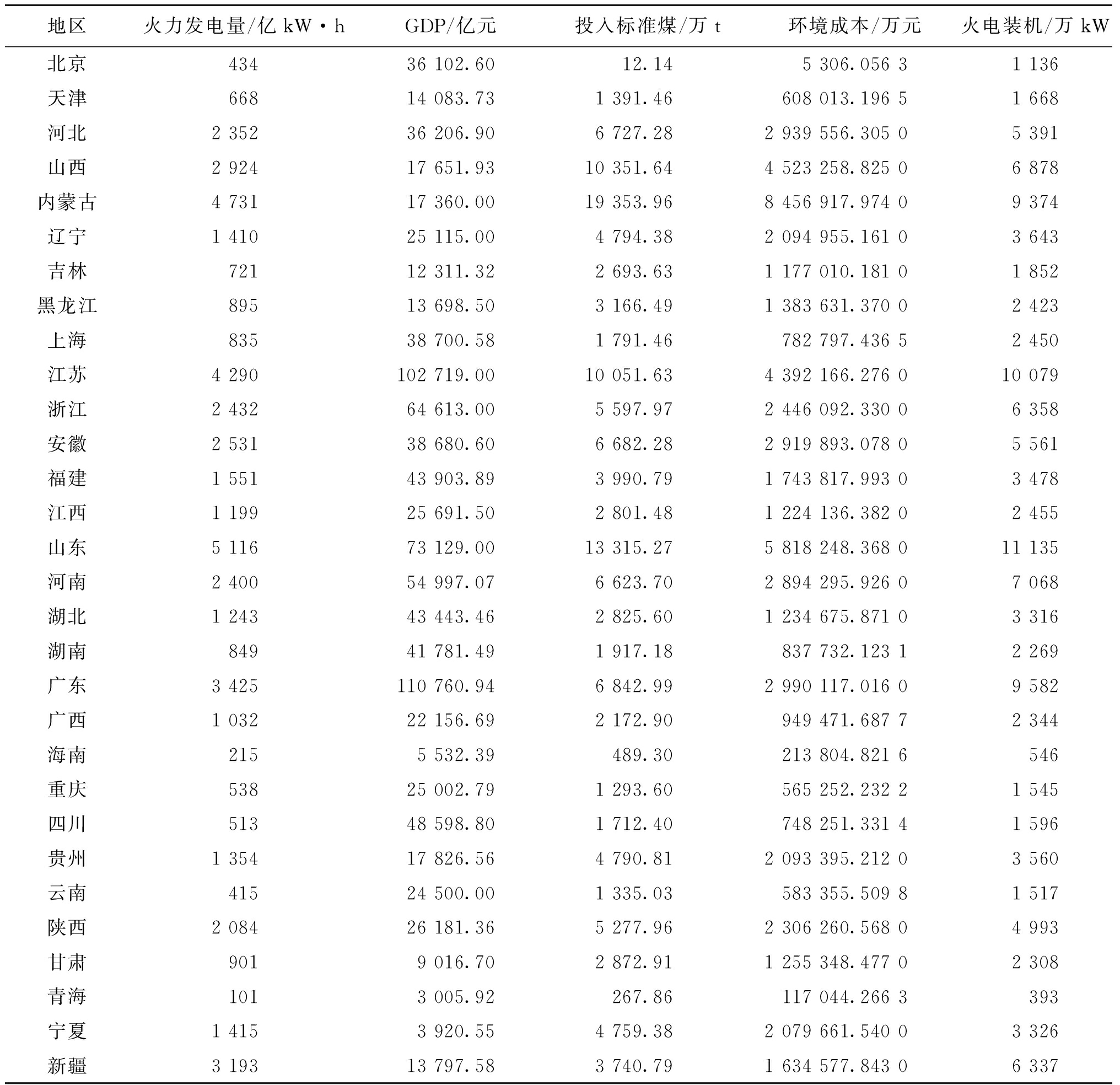 污染物排放量/kg环境价值/(元·kg-1)CO22 391.500.132NOX11.058.000SO21.696.000CO0.361.000粉煤灰151.980.120炉渣41.450.100 表3 各省(自治区、直辖市)投入产出指标数值