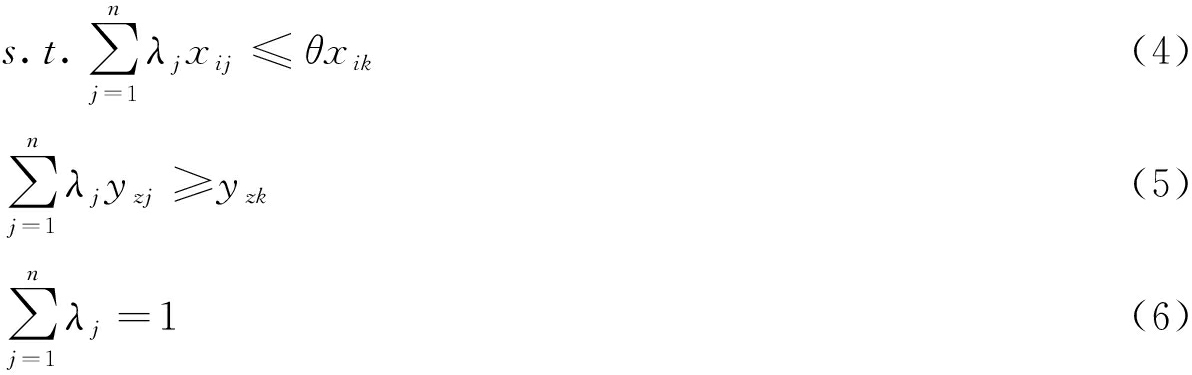 (2) 笔者联系实际选取BCC模型(VRS径向DEA模型)进行系统的效率评价。通过求解DMU的效率θ来判断各省效率是否达到最优。其约束条件如下: