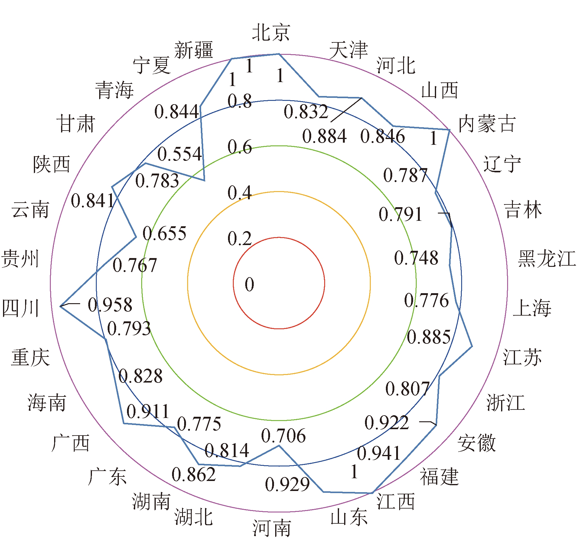 DMU综合技术效率纯技术效率规模效率规模报酬评价结果北京1.0001.0001.000不变DEA有效天津0.8320.8650.961递增非DEA有效河北0.8840.9180.962递减非DEA有效山西0.8460.8461.000不变非DEA有效内蒙古1.0001.0001.000不变DEA有效辽宁0.7870.7871.000不变非DEA有效吉林0.7910.8250.959递增非DEA有效黑龙江0.7480.7700.972递增非DEA有效上海0.7760.8050.964递减非DEA有效江苏0.8851.0000.885递减非DEA有效浙江0.8070.8910.906递减非DEA有效安徽0.9220.9630.957递减非DEA有效福建0.9411.0000.941递减非DEA有效江西1.0001.0001.000不变DEA有效山东0.9291.0000.929递减非DEA有效河南0.7060.7660.921递减非DEA有效湖北0.8140.8680.938递减非DEA有效湖南0.8620.9110.947递减非DEA有效广东0.7751.0000.775递减非DEA有效广西0.9110.9200.991递增非DEA有效海南0.8281.0000.828递增非DEA有效重庆0.7930.8120.978递增非DEA有效四川0.9581.0000.958递减非DEA有效贵州0.7670.7740.991递增非DEA有效云南0.6550.6780.967递增非DEA有效陕西0.8410.8530.986递减非DEA有效甘肃0.7830.8130.963递增非DEA有效青海0.5541.0000.554递增非DEA有效宁夏0.8440.8650.976递增非DEA有效新疆1.0001.0001.000不变DEA有效 3 各地区火电能源效率及改进方向分析3.1 火电能源效率分析各省(自治区、直辖市)综合效率雷达分布如图1所示。