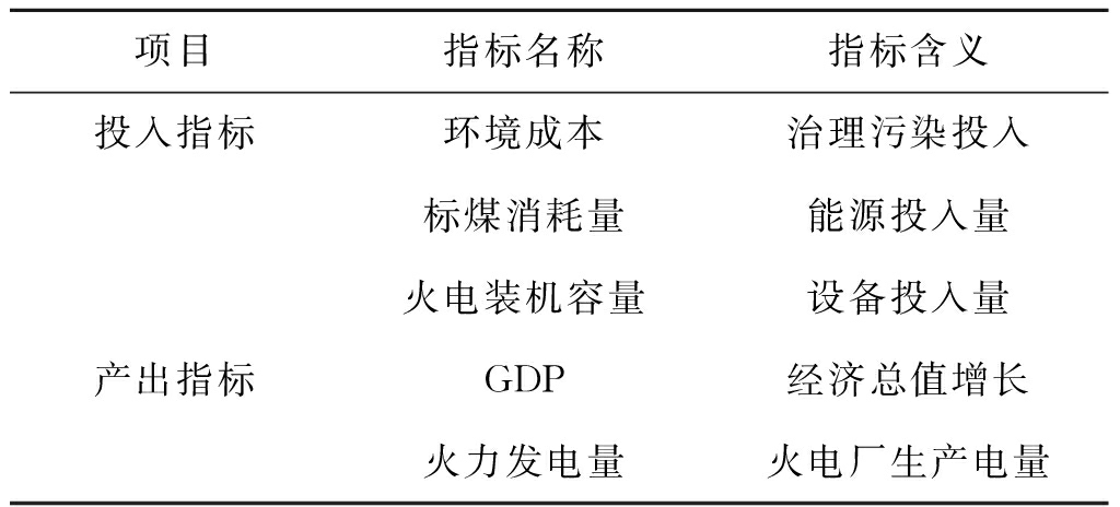 式中:θ——DMU 的效率; λj——各省的权重组合,通过对30个省(自治区、直辖市)按照不同权重比例进行产出或投入要素的加总可以帮助计算出需要评价地区的效率,λ≥0; yzj——第j个DMU的第z种产出要素; xij——第j个DMU的第i种投入。 以上约束条件的含义是在产出不小于第k个省(自治区、直辖市)的条件下,要尽可能少的投入要素,并以此得到第k个省(自治区、直辖市)的效率θ。若θ=1,则说明无法通过权重组合使得产出不减少的情况下减少投入,即该省级的效率达到最优。 选取非导向投入优先的径向DEA模型评估火电能源经济系统的效率。火力发电最直观地产出为火力发电量,而电力用于社会生产拉动经济发展,由此选取经济的量化指标GDP和火力发电量为产出指标。输入变量侧重于发电侧的能源投入,即火电厂所消耗的各种能源,由于火电厂并非使用单一能源发电,不同能源间的投入比较需要有统一的度量标准,因此将各种能源消耗量折合为标煤消耗量来代表能源投入量。火力发电过程中排出大量有害气体,由此引起了不小的环境污染损失,带来环境外部性损失不可忽视,火电行业应该承担其成本。故笔者选取火力发电耗煤量、装机容量和污染物的环境价值为投入指标,生产电力量和GDP为产出指标,具体如表1所示。 表1 投入和产出评价指标