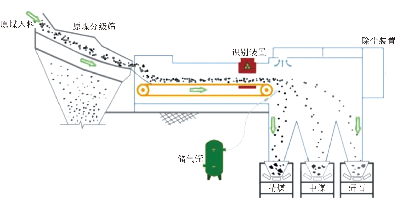 图3 现场磁选机效率检查 (4)依托智能化改造,提升质量管理效能。哈尔乌素露天煤矿选煤厂先后开展块煤三产品智能干选、智能输送、智能装车等研发类科技创新项目,初步形成“分步设计、分工艺推进、分阶段实施、分模块建设”的智能化建设思路。始终秉持前瞻性整体设计、完整性单体建设、融合性工艺衔接原则,以选煤工艺技术智能化研究为基础,确立了具体建设路——智能选煤、智能供配电、智能安全保障系统、智能设备状态感知、智能生产辅助系统、智能管理系统、基础平台优化,借助七大建设模块实现2022年底智能选煤厂中、高级建设目标。已形成原煤6 mm深度筛分,块煤(6~70 mm)重介浅槽分选,大块(+70 mm)三产品智能干选用于分选新工艺。三产品智能干选工艺采用X射线和图像识别技术和深度学习算法技术将入料识别为精煤、中煤和矸石3类,再通过算法控制执行机构将大块原煤最终分选为精煤、中煤和矸石3种产品。块煤三产品智能干选示意如图4所示。