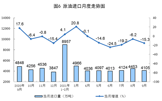原油生产略有加快,加工量继续下降。9月份,生产原油1661万吨,同比增长3.2%,增速比上月加快0.9个百分点,比2019年同期增长5.7%,两年平均增长2.8%,日均产量55.4万吨;加工原油5607万吨,同比下降2.6%,降幅比上月扩大0.4个百分点,比2019年同期下降1.3%,两年平均下降0.7%,日均加工186.9万吨。 1—9月份,生产原油14984万吨,同比增长2.5%,比2019年同期增长4.3%,两年平均增长2.1%;加工原油52687万吨,同比增长6.2%,比2019年同期增长9.4%,两年平均增长4.6%。 原油进口降幅扩大,国际原油价格有所上涨。9月份,进口原油4105万吨,同比下降15.3%,降幅比上月扩大9.1个百分点;1—9月份,进口原油38740万吨,同比下降6.8%。9月30日,布伦特原油现货离岸价格为77.81美元/桶,比8月31日上涨5.9%。