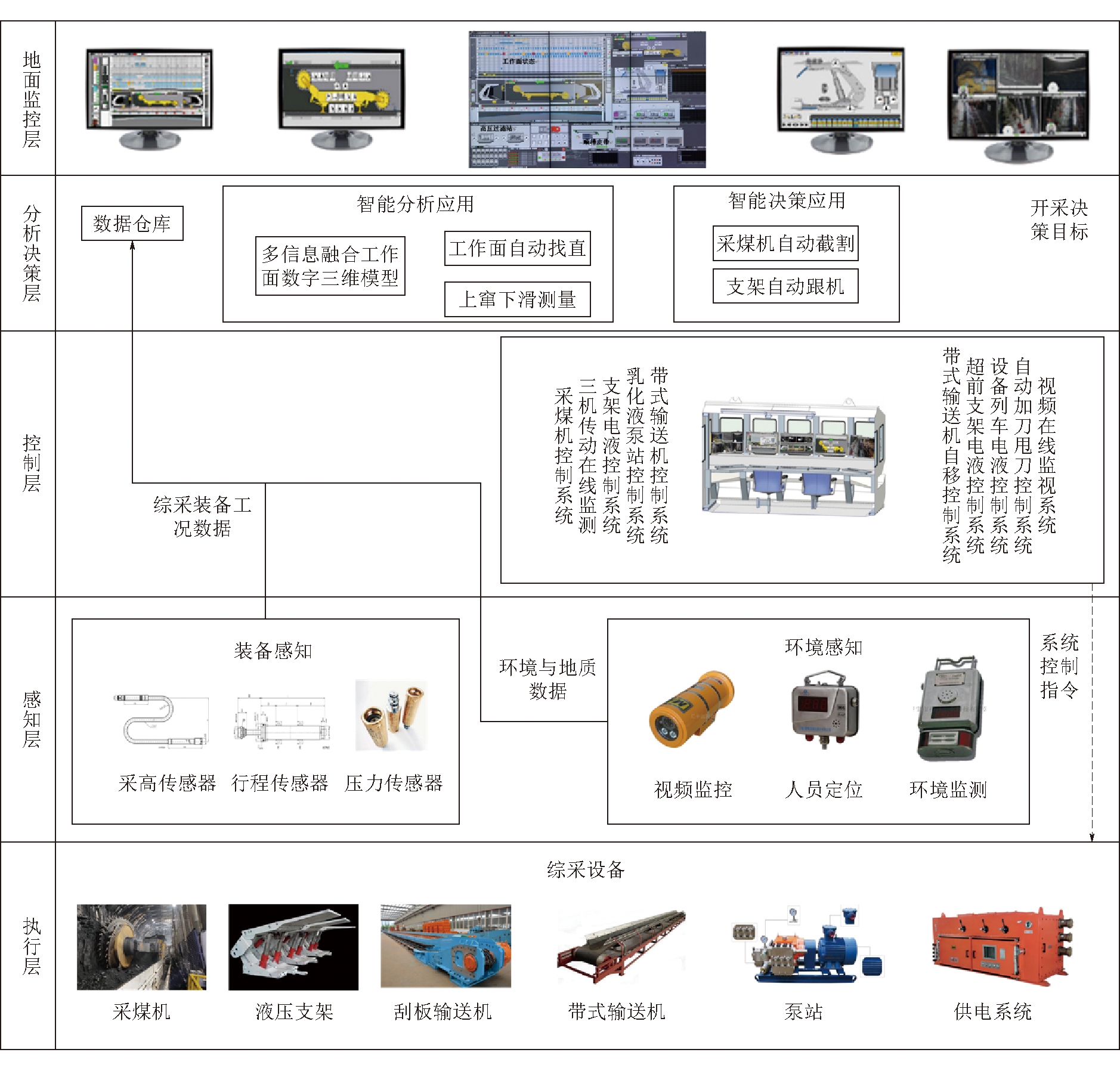 图3 采煤机路径规划和程序割煤流程 2.5 综采工作面远程智能化控制技术研发了集本地控制、巷道集中控制和地面远程控制于一体的工作面智能化控制系统,实现了采煤机精确定位、路径规划和程序割煤,液压支架自动找直跟机、自动加刀甩刀、自动摆底,带式输送机自移,设备列车自移以及综采工作面设备故障预警、视频监控、远程智能监测监控和一键启停等功能。 综采工作面远程智能控制系统架构如图4所示。