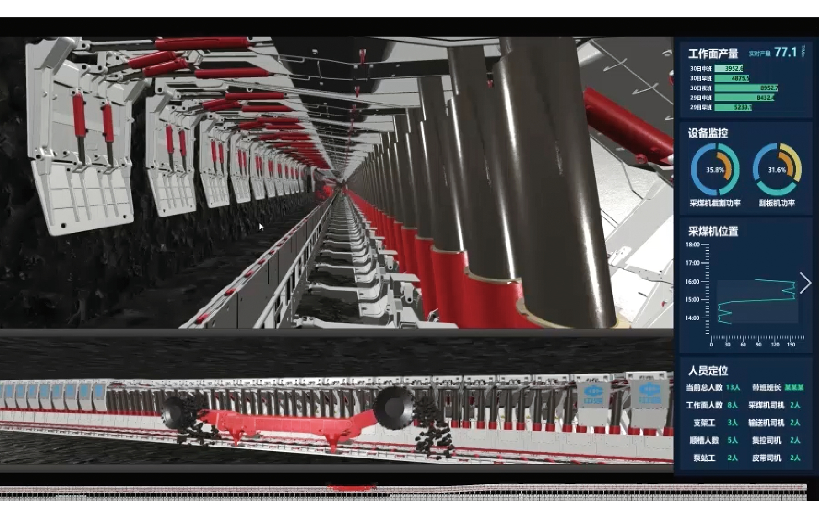 图5 运输巷带式输送机机尾横向跑偏自动调整流程 3 工业性试验纳林河二号煤矿3-1上煤层一盘区102智能化综采工作面的煤层可采厚度为1.66~2.85 m,平均厚度为2.35 m,适合厚煤层一次采全高,设计生产能力为200万t/a。经过1年多的工业性测试、调试和改进,102智能化综采工作面实现了全工作面程序割煤、液压支架自动跟机、工作面自动调直和采煤机精确定位、综采工作面设备集中控制与管理、远程智能化监测监控和一键启停等功能,融合采煤机自动截割、液压支架及端头支架的自动移架、运输系统智能化运行、远程视频监控、工作面远程集控等关键技术,实现了整个工作面的“有人巡视、无人操作、远程干预、安全高效、绿色节能”。工控平台具备显示设备运行、环境和人员动态等功能,依据实时数据分析,工控平台具备生成和显示工作面三维虚拟场景及组件受力状况、跟机视频显示等功能。 102智能化综采工作面内实现了无操作人员,单班生产人员比改进前减少6人,现仅需5人(工作面巡视工1人,班长1人,机头,机尾巡检各1人,控制台1人),每年节约生产人员工资约725万元。智能化综采工作面设备故障诊断功能较强,不仅能够及时发现和处理设备故障还能杜绝设备事故发生,降低了设备运行成本、提高了设备开机率。同时,智能化综采工作面的建设能将大批现场操作人员从工作面复杂的工作环境中解脱出来,大幅降低了现场作业人员的劳动强度,保障了职工的生命安全,提高了矿工的获得感、安全感、幸福感,具有显著的经济效益和社会效益。 4 结语通过构建“远程一键式启停、自动开采为主、远程人工干预为辅,最终实现无人值守”为目标的减人、提效开采模式,融合采煤机自动截割、液压支架及端头支架的自动移架、运输系统智能运行、工作面远程集控、数字孪生等关键技术,以工作面人员识别系统、顶板压力监测系统、设备故障诊断系统和工作面视频系统为保障,以工业总线网络为通道,以大数据分析和处理为依据,以高端集控设备为平台,实现了井下集控、地面远控,建成了具有主动感知、自动分析、智能决策的智能化少人工作面,实现了综采工作面的“有人巡视、无人操作、远程干预、安全高效、绿色节能”。 [1] 王国法,刘峰,孟祥军,等.煤矿智能化(初级阶段)研究与实践[J].煤炭科学技术,2019,47(8):1-36. [2] 刘峰,曹文君,张建明.持续推进煤矿智能化 促进我国煤炭工业高质量发展[J].中国煤炭,2019,45(12):32-36. [3] 李首滨.智能化开采研究进展与发展趋势[J].煤炭科学技术,2019,47(10):102-110. [4] 葛世荣,郝尚清,张世洪,等.我国智能化采煤技术现状及待突破关键技术[J].煤炭科学技术,2020,48(7):28-46. [5] 王国法,赵国瑞,任怀伟.智慧煤矿与智能化开采关键核心技术分析[J].煤炭学报,2019,44(1):34-41. [6] 范京道,闫振国,李川.基于5G技术的煤矿智能化开采关键技术探索[J].煤炭科学技术,2020,48(7):92-97. [7] 姜德义,魏立科,王翀,等.智慧矿山边缘云协同计算技术架构与基础保障关键技术探讨[J].煤炭学报,2020,45(1):484-492. [8] 黄曾华,王峰,张守祥.智能化采煤系统架构及关键技术研究[J].煤炭学报,2020,45(6):1959-1972. [9] 程建远,朱梦博,王云宏,等.煤炭智能精准开采工作面地质模型梯级构建及其关键技术[J].煤炭学报,2019,44(8):2285-2295. [10] 张帆,葛世荣,李闯.智慧矿山数字孪生技术研究综述[J].煤炭科学技术,2020,48(7):168-176. [11] 方新秋,梁敏富,李爽,等.智能工作面多参量精准感知与安全决策关键技术[J].煤炭学报,2020,45(1):493-508. [12] 高有进,杨艺,常亚军,等.综采工作面智能化关键技术现状与展望[J].煤炭科学技术,2022,49(8):1-22. Application study on the key technology for intelligent fully mechanized mining face in medium-thick coal seam in Inner Mongolia-Shaanxi region