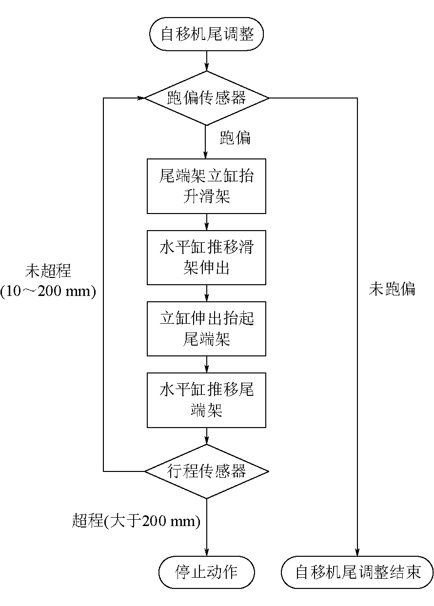图4 综采工作面远程智能控制系统架构 2.6 工作面带式输送机自移机尾和纠偏技术在运输巷中,带式输送机机尾与自移机尾相连,自移机尾调节带式输送机的纵向位移,使带式输送机可以保持与工作面推进步距同步。自移机尾也可以调整带式输送机机尾的横向位移,防止自移机尾向前推进时因为地势起伏或设备动作的不协调,造成自移机尾中心线与带式输送机中心线不对中,从而导致辊筒胶带撕裂。传统工序中,带式输送机机尾的横向跑偏只能由人工手动操纵设备进行调整,调整时人员站在带式输送机旁边操作设备,效率低下,同时有被飞溅的煤块砸中的安全风险。 为了使带式输送机横向跑偏位移自动减少,防止胶带撕裂,同时提高效率和消除隐患,提出了一种运输巷带式输送机机尾横向跑偏自动调整方法。当跑偏传感器检测到带式输送机跑偏时,系统将尾端架的滑架收起,通过水平油缸将滑架沿跑偏方向推出并得到相应的补偿位移,之后将滑架落地并支撑起尾端架,由水平缸推移滑座向偏移方向移动相应的补偿位移,带式输送机的跑偏位移与尾端架的补偿位移相互抵消,从而纠正跑偏。整个过程由系统根据传感器的反馈自动进行调节,提高了效率并降低了工作人员的安全风险。运输巷带式输送机机尾横向跑偏自动调整流程如图5所示。