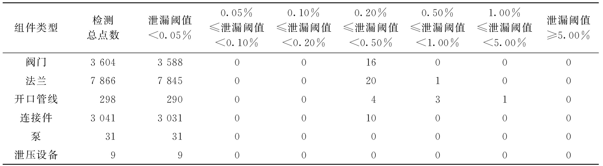 图5 密闭+引入负压+生物滤池工艺流程示意 污水处理工序预处理系统废气、好氧系统废气、厌氧系统废气、泥系统废气等通过吸风管道经鼓风机加压以后送至生物除臭装置,加湿泵将循环水通过喷淋系统给混合气体进行加湿预洗,预洗后的混合气体进入生物滤池,与附着于填料上的微生物进行接触,进入微生物体内的有机污染物作为能源和营养物质被分解转化成无害的化合物[12],从而完成对混合气体中有机污染物组分的吸收,剩余混合气体达标排放。 2.1.5 泄漏检测与修复(LDAR) 根据《石油化学工业污染物排放标准》(GB31571-2015)、《石化企业泄漏检测与修复工作指南》及《挥发性有机物无组织排放标准》(GB37822-2019)等相关规范要求,鄂能化公司委托第三方单位根据全厂装置工艺和物料属性,对可能造成VOCs泄漏污染的阀门、法兰、连接件、泵、泄压设备等组件进行分类、编号和现场拍照、挂牌,建立泄漏检测与修复信息数据库,确保各类组件能够按照法规标准要求的检测方法、频率、泄漏阈值、维修期限等及时得到检测和维修。 2020年,合规检测的组件现场挂牌数为2 610块,总检测点数为14 849个。其中阀门检测点个数为3 604个,法兰检测点为7 866个,开口管线为298个,泵的检测点为31个,泄压设备检测点为9个,连接件检测点为3 041个。 根据规范规定的气体/蒸汽与轻液的泄漏阈值为0.20%、重液为0.05% ,2020年检测结果超过阈值的共有55个。泄漏检测值分布如表5所示。其中,泄漏阈值小于0.05%的检测点占比99.6%,泄漏阈值大于等于0.20%且小于0.50%的检测点占比0.30%,泄漏阈值大于等于0.50%且小于1.00%的检测点占比0.027%,泄漏阈值大于等于1.00%且小于5.00%的检测点占比0.006 7%。 表5 2020年全厂泄漏检测值分布表 个