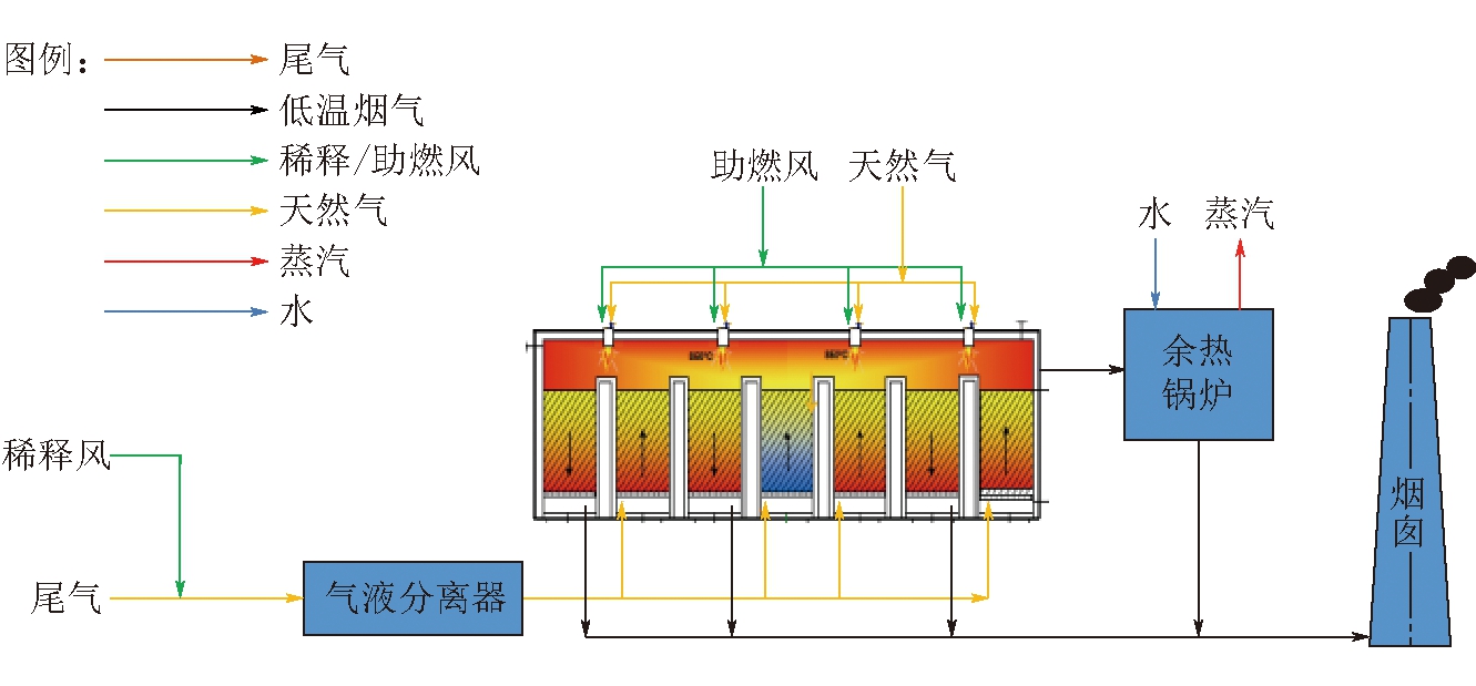 焚烧炉适宜的废气入口浓度/(mg·Nm-3)废气入口浓度要求RTO炉2 000~10 000<25% 爆炸下限DFTO炉可燃物浓度可达到燃烧自平衡无要求 从表4中可知,由于低温甲醇洗尾气为本质安全的废气,其浓度在爆炸下限以下,通过稀释配风可保证废气浓度在爆炸下限25%以下,符合RTO炉对废气入口浓度的要求。而液氮洗尾气、甲醇合成闪蒸气、甲醇合成膨胀气这3种废气由于其浓度高,要采用蓄热式焚烧技术将废气浓度降低至爆炸下限的25%以下,其中必须通过增加配风量来满足要求,而配风过程就会穿越这3种高浓度废气的爆炸区域,存在不安全的因素,而采用DFTO炉则没有此要求,因此从安全角度考虑,低温甲醇洗尾气采用RTO蓄热式氧化焚烧技术,液氮洗尾气、甲醇合成闪蒸气、甲醇合成膨胀气这3种高浓度废气则采用DFTO直燃式氧化焚烧技术。 RTO蓄热式氧化焚烧工艺如图1所示。低温甲醇洗尾气在进入RTO之前,先经过稀释风稀释,保证VOCs浓度低于爆炸下限的25%以下,同时也保证入口气体氧含量充足,尾气经过稀释之后进入气液分离器分离液体后进入RTO炉进行热氧化处理,尾气从下往上流过陶瓷蓄热体,在这一过程中尾气得到预热,大部分烃类物质被氧化后到达燃烧室,此时废气温度达到850 ℃,尾气中VOCs被完全氧化。高温烟气从上往下流过其他蓄热体,热量从气体传递到蓄热体,释放出热量的低温烟气从RTO下室体排出。在保证蓄热体具有足够热量的同时,多余的高温烟气通过热旁通烟道进入RTO余热锅炉,高温烟气在余热锅炉内与脱盐水换热后降温排出。RTO余热锅炉副产5.1 MPa(g) 、460 ℃次蒸汽送入全厂蒸汽管网。RTO下室体出口烟气与余热锅炉出口烟气混合后排入烟囱。