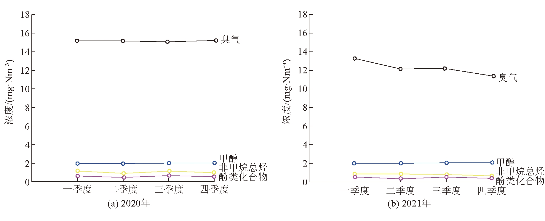 组件类型检测总点数泄漏阈值<0.05%0.05%≤泄漏阈值<0.10%0.10%≤泄漏阈值<0.20%0.20%≤泄漏阈值<0.50%0.50%≤泄漏阈值<1.00%1.00%≤泄漏阈值<5.00%泄漏阈值≥5.00%阀门3 6043 5880016000法兰7 8667 8450020100开口管线298290004310连接件3 0413 0310010000泵3131000000泄压设备99000000 2.2 治理效果鄂能化公司采用以上VOCs治理技术或控制措施对厂区放散点VOCs进行收集、净化处理,使得现场区域异味明显减少,职工及周边牧民生活质量得到改善,环保处罚减少,环保管理标准得到提升,社会效益显著。 2020-2021年厂界空气中挥发性废气浓度如图6所示。