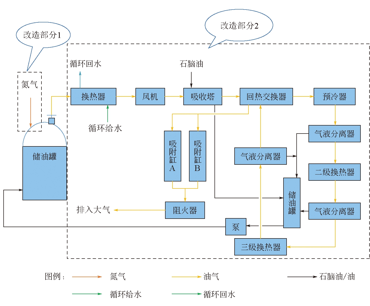 图2 DFTO直接式氧化焚烧工艺示意 DFTO炉焚烧后的950 ℃烟气进入过热器,温度降低至850 ℃左右,然后烟气分别流经二级预热器、空气预热器、预热锅炉、一级预热器进行热交换,温度被降至170 ℃以下,最后通过引风机送到烟囱排放。副产的5.1 MPa(g) 、460 ℃过热蒸汽送入全厂蒸汽管网。 2.1.2 氮封+吸收+冷凝+吸附 综合罐区VOCs排放为无组织排放,回收难度较大[10],其治理项目包括粗苯、粗酚、中温煤焦油、煤基沥青、甲醛等储罐及装卸站台的无组织VOCs废气。 由于综合罐区属于重大危险源区域,严禁使用明火或散发火花的装置存在,同时罐区实际空间有限,从表2可以看出,催化燃烧法、蓄热燃烧法、直接燃烧法、膜分离法、生物降解法、光催化降解法均不适用于罐区VOCs治理。但罐区仅采用储罐呼吸阀控制VOCs排放常常又达不到预期效果,经综合比较分析,鄂能化公司通过技术改造最终选择了氮封+吸收+冷凝+吸附工艺处理技术来治理罐区VOCs排放。氮封+吸收+冷凝+吸附工艺流程如图3所示。