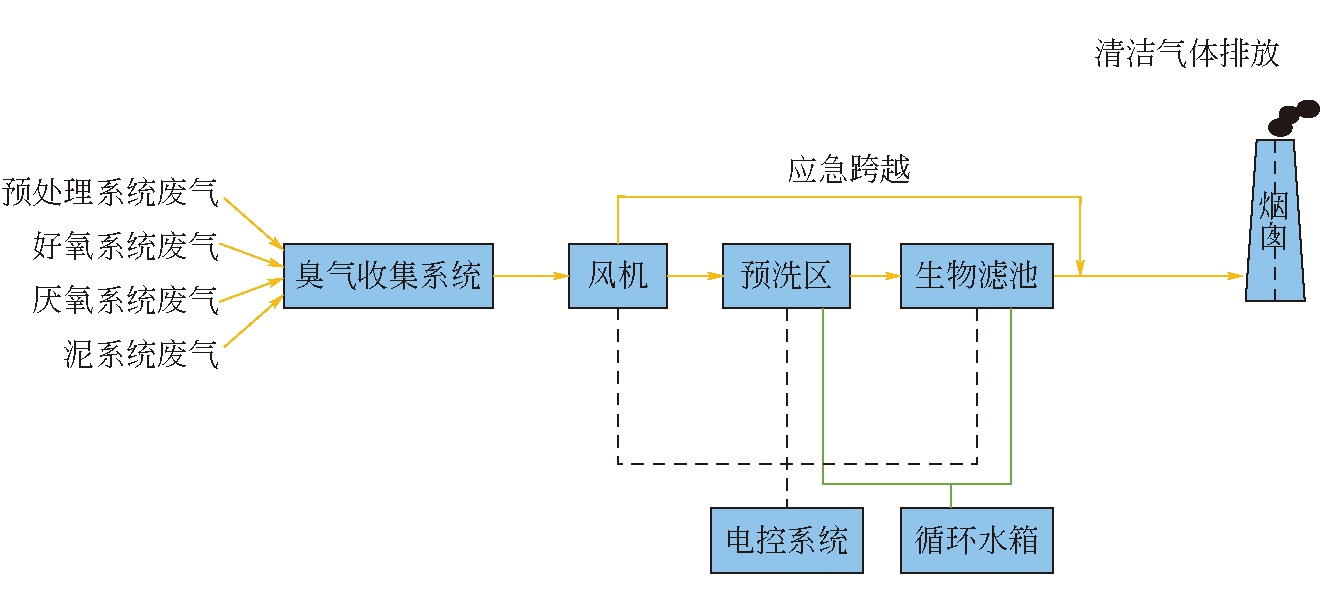 图4 氮封+密闭+收集+锅炉燃烧工艺流程示意 (1)氮封单元。初焦油分离器上设置氮封系统装置,维持初焦油分离器内相对空间压力在2~3 kPa(g)之间,当初焦油分离器气相对空间压力高于3 kPa 时,氮封阀关闭,停止向初焦油分离器供氮,当初焦油分离器气相对空间压力低于2 kPa 时,氮封阀开启,开始补充氮气,保证初焦油分离期器内膨胀气、放空气始终被“氮膜”密封。 (2)密闭单元。各机泵、分离器、储罐等设备导淋煤气水经管道集中密闭排放至焦油污水槽中,经泵加压后送入初焦油分离器再次进行分离,减少挥发面积。 (3)收集单元。粗焦油分离器、油分离器、洁净焦油槽、油槽、煤气水产品罐、缓冲罐等设备顶部均安装有呼出压力为3 kPa(g)的低压呼吸阀,当设备内气相压力超过3 kPa(g)时,释放的放空气通过低压呼吸阀进入放空气管道,汇集至放空罐。 (4)锅炉燃烧单元。放空罐压力达到3.5 kPa(g)后,变频式放空气鼓风机开启,放空气经变频式放空气鼓风机升压后排至锅炉,经充分燃烧后达标排放。 2.1.4 密闭+引入负压+生物滤池 根据供排水装置VOCs排放情况,其治理项目需处理污水处理工序的短链轻质挥发性有机废气。根据最新相关环保要求,煤化工污水处理设施VOCs废气需要进行密闭收集处理,以满足国家和地方对VOCs排放浓度的相关要求[11],鄂能化公司在建厂初期就采用了高于原标准的设计,采用了密闭+引入负压+生物滤池技术,如图5所示。