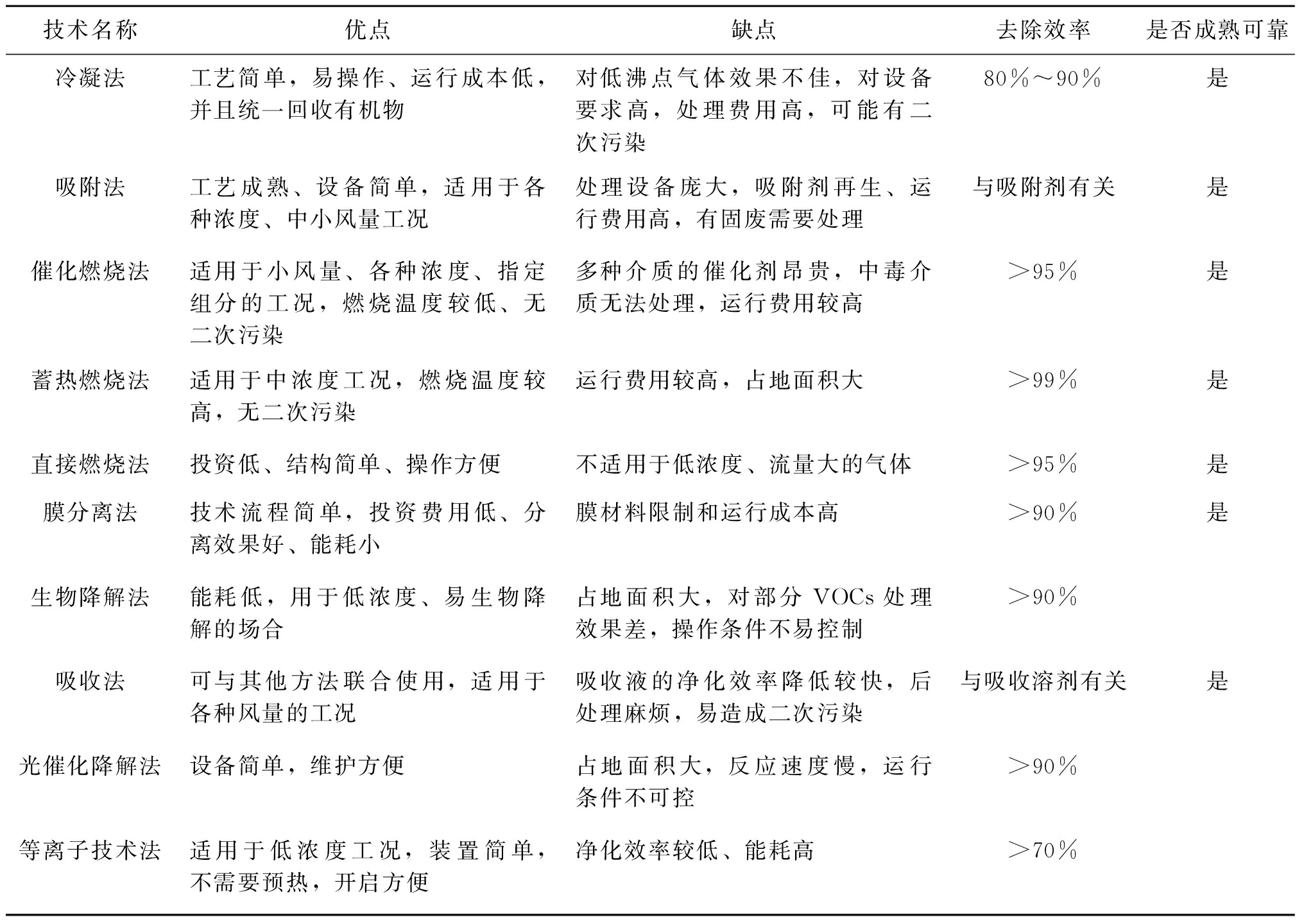 装置作用VOCs来源产生原因排放方式煤气化装置产生粗煤气,并经变换、酚氨回收、煤气水分离净化,从而回收副产品酚氨回收工序酸性气;煤气水分离工序放空气、膨胀气;地沟有机液体闪蒸气;离心机固液分离过程的挥发气酸性气、膨胀气就地放空;放空气、地沟闪蒸气无组织放空或逸散;阀门、法兰、连接件泄漏有组织/无组织净化装置煤气脱硫脱碳,配比合成气洗涤塔排放气低温甲醇洗工序经尾气洗涤塔处理后的尾气有组织排放;阀门、法兰、连接件泄漏有组织/无组织甲醇合成装置合成甲醇产品甲醇合成闪蒸气、膨胀气甲醇合成工序闪蒸气、不凝气的有组织排放;阀门、法兰、连接件泄漏有组织/无组织供排水装置提供生产用水、回收处置生产废水污水处理工序液面释放气溶解于污水中的短链轻质组分的释放;阀门、法兰、连接件泄漏有组织/无组织罐区储存粗苯、粗粉、甲醇、甲醛及煤焦油等油品装卸站台作业过程及储罐呼吸阀的放空气由于装卸作业未采用密闭装卸或储罐呼吸阀超压放空;阀门、法兰、连接件泄漏无组织 1.2 VOCs治理技术选择我国主要的VOCs的治理技术包括冷凝吸附、催化燃烧、蓄热燃烧、直接燃烧、膜分离、生物降解、吸收、光催化降解、等离子技术等[4-8],不同技术方法的特点[5]如表2所示。 表2 我国主要VOCs治理工艺技术特点