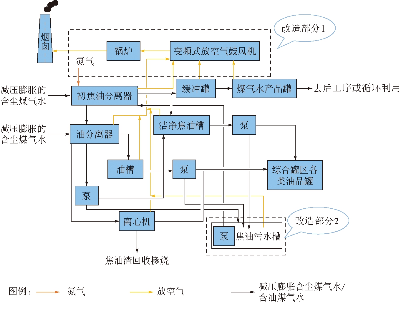 图3 氮封+吸收+冷凝+吸附工艺流程示意 (1)氮封单元。储罐上设置氮封系统装置,维持罐内相对空间压力在2~3 kPa(g)之间,当储罐气相对空间压力高于3 kPa时,氮封阀关闭,停止向储罐供氮,当储罐气相对空间压力低于2 kPa时,氮封阀开启,开始补充氮气,保证储罐内油气始终被“氮膜”密封。 (2)吸收单元。罐区油气通过循环水冷却降温后经风机增压进入吸收塔,在吸收塔通过石脑油对油气进行洗涤,除去其中可以溶解的挥发性气体,洗涤完的气体送去冷凝单元。 (3)冷凝单元。洗涤吸收后的气体进入冷凝单元,冷凝采用微正压三级梯度式冷凝,进入回热交换器与冷凝处理后的气体进行回热交换后继续进入冷凝单元进行多级冷凝:先经预冷器后气体被冷却,冷凝出部分油和水进入气液分离器分离出液相部分,气相再进入二级换热器冷却,进一步析出一部分油,经气液分离器分离出液相部分后,气相部分再进入三级换热器,进一步析出一部分油,至此大部分的烃类组分被冷凝液化析出,分离出的油回收到储油罐。 (4)吸附单元。冷凝单元出来未被冷凝处理的低浓度油气,进入到吸附系统,吸附系统由2个吸附缸交替进行“吸附—脱附—清扫”过程,在常压下吸附缸A吸附原料中的剩余油气组分,当吸附饱和后系统自动切入吸附缸B进行吸附处理,同时吸附缸A进行真空脱附使吸附剂获得再生,脱附出的油气进行循环冷凝处理;经过吸附系统分离出来的达标尾气经阻火器安全排空。 2.1.3 氮封+密闭+收集+锅炉燃烧 根据煤气化装置VOCs排放情况,其治理项目需处理酚氨回收工序酸性气、煤气水工序的放空气、膨胀气、地沟闪蒸气、离心机厂房挥发气。 在实际运行过程中,由于酸性气、膨胀气、放空气含水率较高,在输送过程中与酚氨回收工序的酸性气合并送至锅炉焚烧,在管道内发生化学反应:CO2 + NH3 + H2O = NH4HCO3,生成的碳酸氢氨在饱和状态下有晶体析出,从而导致管道堵塞,膨胀气、放空气外漏至环境中。同时由于采用敞口式排液沟槽、厂房,导致地沟闪蒸气、离心机厂房挥发气大量挥发至环境中,造成污染。经升级改造,采用氮封+密闭+引入负压+锅炉燃烧工艺处理技术(图4)后,管道堵塞情况明显改善,酸性气、膨胀气、放空气、地沟闪蒸气、离心机厂房挥发气可全部进入锅炉燃烧处理。