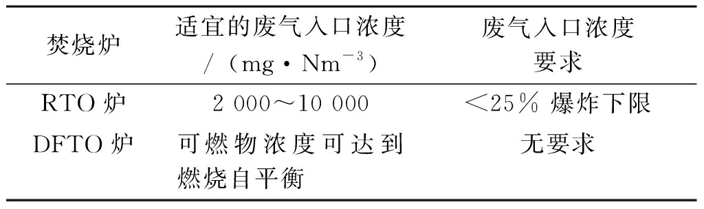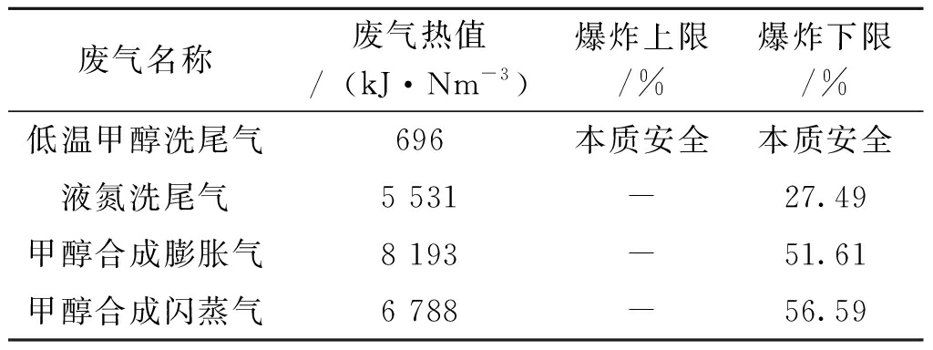 废气名称废气热值/(kJ·Nm-3)爆炸上限/%爆炸下限/%低温甲醇洗尾气696本质安全本质安全液氮洗尾气5 531-27.49甲醇合成膨胀气8 193-51.61甲醇合成闪蒸气6 788-56.59 从表3可知,低温甲醇洗尾气是本质安全的废气,在空气中任何浓度都不会爆炸,而液氮洗尾气与甲醇合成闪蒸气及膨胀气的爆炸下限分别为27.49%、51.61%、56.59%,在空气中的泄露量只要在此爆炸范围内就可能发生爆炸事故。 鄂能化公司对净化装置、甲醇合成装置VOCs治理选用RTO蓄热式氧化焚烧技术+DFTO直燃式氧化焚烧技术。2种治理技术所用焚烧炉对废气入口浓度要求如表4所示。 表4 2种焚烧炉对废气入口浓度要求