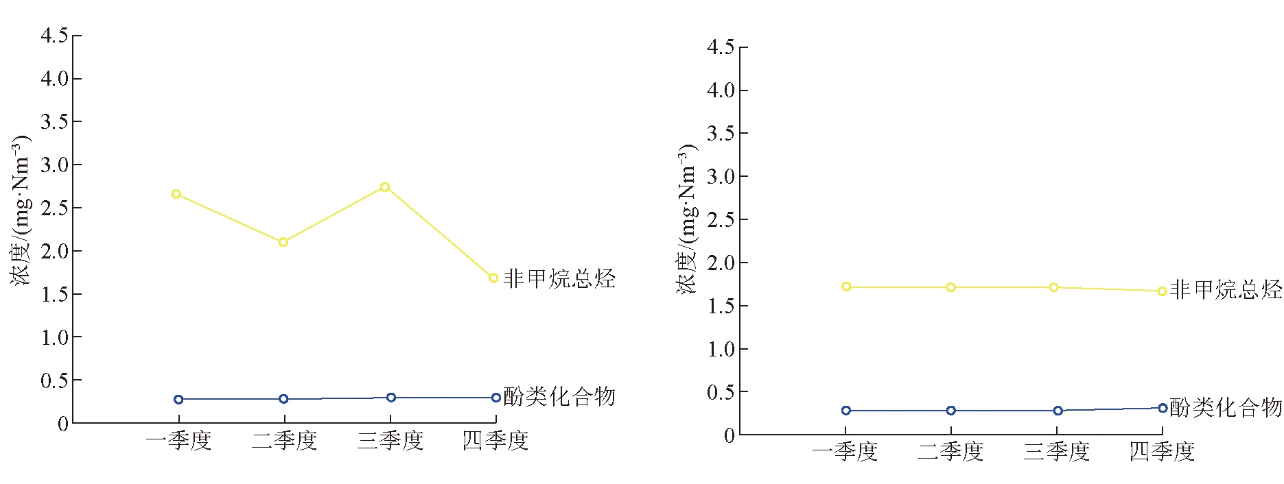 废气名称处理前非甲烷总烃/(mg·Nm-3)处理后非甲烷总烃/(mg·Nm-3)处理效率(考虑配风量后)低甲尾气2 700<80>95%液氮洗尾气0<80-闪蒸气3 500<80>96%膨胀气4 600<80>97% 罐区储罐呼吸阀呼出的挥发性气体经吸收、冷凝、吸附净化处理后,全部回收至罐区储存或外售,在改善厂区环境的同时间接增加了油品产量。装卸站台鹤位在改为万向节液下充装方式后,由半敞开方式改为密闭充装,减少了挥发性气体与空气的接触面积,降低了作业过程安全风险。 煤气化装置煤气水分离工序的膨胀气中的水分得到绝大部分回收,膨胀气、放空气、酸性气经风机加压后集中送过锅炉焚烧,有效回收热附加值,同时消除管道结晶堵塞,保证环境质量及系统长周期运行。 供排水装置污水处理工序废水中的短链轻质挥发性气体经集中收集处理后,排气筒废气排放浓度如图7所示。 由图7中看出,经生物滤池降解的废气排放指标均低于《大气污染物综合排放标准》(GB16297-1996)中非甲烷总烃≤120 mg/Nm3,酚类化合物≤100 mg/Nm3的排放限值。