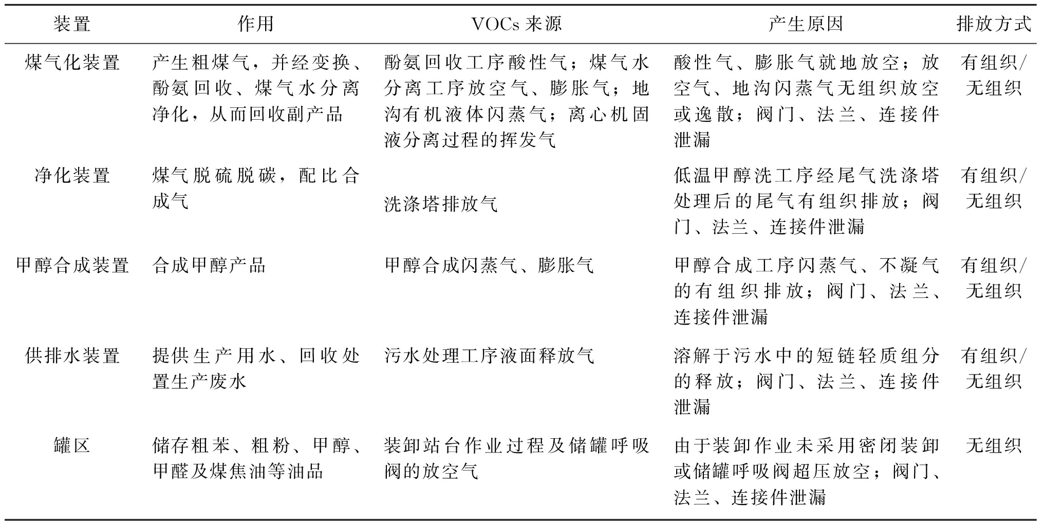 大型煤化工企业VOCs治理技术研究与应用近年来,关于防治挥发性有机物(Volatile Organic Compounds,VOCs)等气体污染物的方案、政策相继发布,特别是习近平总书记提出“绿水青山就是金山银山”科学论断后,我国进一步加强了挥发性有机物污染防治力度,体现了我国继续推进挥发性有机物总量减排控制、深化工业污染源深度治理的决心和行动。鄂尔多斯作为煤化工发展的重要基地,由于煤化工行业VOCs的排放量较大,成分复杂,给当地大气臭氧指标带来了很大压力,影响区域绿色发展。中煤鄂尔多斯能源化工有限公司(以下简称“鄂能化公司”)作为鄂尔多斯一家大型煤化工企业,探索其VOCs的治理管控措施具有重要的指导意义。 VOCs是指参加大气光化学反应的一类有机化合物的总称[1],或者根据规定的方法测量或核算确定的有机化合物。因其大多具有毒性,有些甚至致癌、致畸和致基因突变,同时其也是形成细颗粒物(PM2.5)和臭氧(O3)的重要前提物,因此,必须严格控制VOCs排放,减少大气污染,保护人类健康,同时促进企业绿色发展。 1 VOCs治理现状1.1 煤化工企业VOCs排放方式及其来源煤化工行业的生产装置复杂,排放污染物种类众多、成分复杂、浓度变化大,根据排放的规律性,VOCS排放主要分为无组织排放和有组织连续排放两类。 无组织排放是指VOCs不经过排气筒的无规则排放。包括开放式作业场所逸散,以及通过缝隙、通风口、敞开门窗和类似开口(孔)的排放[2]。反之,经过集中处理、集中排放的则称为有组织排放。 煤化工VOCs主要是指煤在气化、净化、液化、炼焦等化工生产过程产生的VOCs,煤气化、净化过程中产生的VOCs主要来自气化炉的卸压废气、膨胀气、酸性气。煤液化分为直接液化和间接液化,相比气化过程VOCs的产生量较少,但液化原油及液化残渣易挥发产生VOCs。炼焦过程产生的VOCs主要来自未完全反应的煤粉、焦油、飞灰以及焦炭与空气接触生成的气态污染物[3]。 鄂能化公司VOCs排放主要集中在煤气水分离、低温甲醇洗、污水处理、罐区、槽车装卸及泄漏等工序。其中,煤气水分离、污水处理、罐区、槽车装卸及泄漏等过程无组织散发的苯系物、酚等约占全厂VOCs排放量的60%;低温甲醇洗过程有组织排放的羰基硫、硫化氢、硫化物等虽然浓度不高但总量巨大,约占全厂VOCs排放量的40%。这些都是影响职工作业环境以及造成周边居民对煤化工颇有争议的重要原因。因此,控制VOCs首先应注重无组织排放的收集处理。 鄂能化公司各装置VOCs来源、产生原因及排放方式如表1所示。 表1 鄂能化公司各装置VOCs排放情况