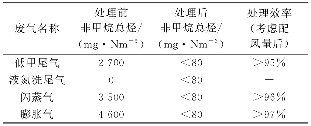图6 2020-2021年厂界挥发性气体浓度变化 由图6中可以看出,2020-2021年,鄂能化公司厂界空气中非甲烷总烃、甲醇、臭气、酚类化合物的浓度指标均低于《大气污染物综合排放标准》(GB16297-1996)和《恶臭污染物排放标准》(GB14554-93)的限值要求,且经过不断改进和技术优化,2021年厂界空气中挥发性废气浓度均低于2020年度。 净化装置、甲醇合成装置产生的低温甲醇洗尾气、液氮洗尾气、甲醇合成膨胀气和闪蒸气经RTO炉+DFTO炉氧化焚烧后,非甲烷总烃排放浓度均低于80 mg/Nm3,去除率均在95%以上,满足《大气污染物综合排放标准》(GB16297-1996)和《石油化学工业污染物排放标准》(GB31571-2015)要求。同时该装置余热锅炉副产蒸汽88 t/h,年产生经济收益可达6 899万元。 表6 4种废气经处理后非甲烷总烃排放值