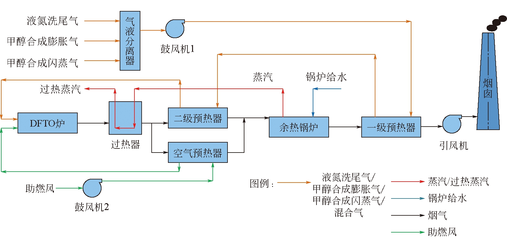图1 RTO蓄热式氧化焚烧工艺示意 液氮洗尾气、甲醇合成膨胀气、甲醇合成闪蒸气尾气采用一台DFTO炉进行焚烧处理,DFTO直接式氧化焚烧工艺如图2所示。3种废气在气液分离器混合后经过鼓风机1加压,逐级进入一级预热器、二级预热器与烟气进行热交换,混合气体最终被预热到450 ℃以上,与经空气预热器升温后的助燃风共同进入DFTO炉的燃烧室进行氧化反应。