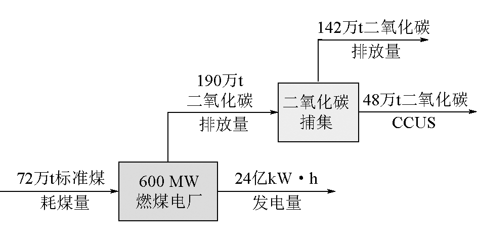 图1 基准方案 2.2 情景二:基准方案+CCUS情景二是在情景一基准方案的基础上,增设锅炉燃烧后CCUS装置,以实现整个电厂25%的二氧化碳减排量。当前情况下燃煤电厂CCUS技术处理成本为450元/t,考虑未来技术进步可实现处理成本降至300元/t。通过对计算结果进行分析,可以得出以下几点。 (1)锅炉燃烧后进行CCUS对煤电度电成本影响较小。燃煤电厂增设CCUS装置后,初始投资和全流程运行成本折合二氧化碳处理成本450元/t,度电成本将增加0.089元/(kW·h)。当前全国碳市场价格水平下,若再考虑减碳收益,度电成本可进一步下降0.010元/(kW·h)。综合来看,煤电+CCUS情景模式度电成本增加0.079元/(kW·h)。 (2)考虑CCUS技术成本下降的潜力,煤电+CCUS情景模式的经济性将显著提升。随着CCUS技术进步和规模化应用,二氧化碳处置成本进一步下降至300元/t时,叠加碳减排收益,系统度电成本增加值可降低至0.050元/(kW·h)。 (3)考虑初始投资使用效率,剩余服役年限较短的燃煤电厂建设CCUS系统经济性相对较差。假设燃煤电厂剩余服役年限仅10 a(低于CCUS系统的设计年限20 a),投资建设CCUS系统的设备折旧成本将成倍增加,估算碳处理成本由450元/t增长至600元/t,度电成本增加则由0.090元/(kW·h)提高至0.120元/(kW·h)。考虑技术进步吨碳处理成本降为400元/t,叠加碳减排收益,度电成本增加0.070元/(kW·h)。