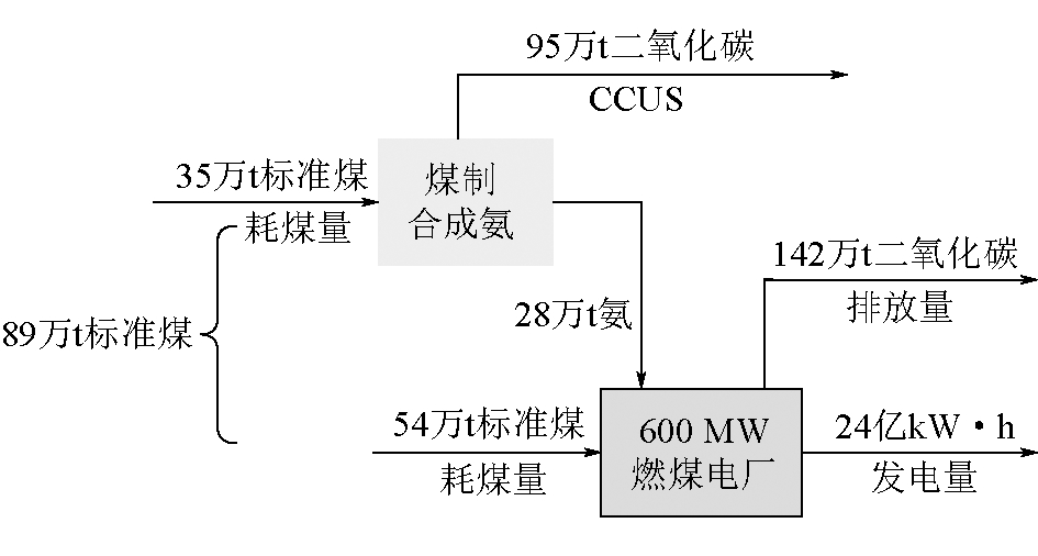图2 基准方案+ CCUS 2.3 情景三:基准方案+“蓝氨”情景三是在情景一基准方案的基础上,通过掺烧按热值计25%的“蓝氨”来实现25%的二氧化碳减排率。情景三的基本说明如下:传统煤制合成氨主要包括空气分离、气化、变换、低温甲醇洗、液氮洗、氨合成等工艺单元。“蓝氨”是在传统煤制合成氨生产流程基础上增设CCUS装置,利用化工过程二氧化碳浓度高的优势,以较低成本实现碳减排。情景分析中,当前化工过程CCUS成本按200元/t计算,未来技术进步后可降至150元/t,通过对计算结果进行分析,可以得出以下结论。 (1)从全过程角度看,掺烧“蓝氨”并不会降低系统碳排放。由于氨气热值(18.6 MJ/kg)仅为标准煤热值(29.3 MJ/kg)的64%左右,替代25%燃料煤需要氨的总量约28万t/a。参照国内合成氨平均耗煤水平,每吨合成氨生产过程排放二氧化碳量约3.3 t(其中工艺过程排放2.4 t,动力过程排放0.9 t)[3]。总体看,煤制合成氨的生产过程将会排放二氧化碳95万t,则系统的碳排放总量净增47万t。由于“蓝氨”生产过程中已经由CCUS技术实现零碳排放,则情景三条件下碳排放依然是减少48万t。 (2)采用“蓝氨”掺烧,整体系统能量利用效率降低。据调研,国内合成氨的生产工艺过程平均能耗为1.264 t标准煤/t,采用先进工艺的煤制氨能耗为1.100 t标准煤/t。煤制氨系统过程的能量利用效率约50%。假定氨的燃烧对热效率产生影响较小,考虑煤制合成氨能耗损失,掺烧25%“灰氨”后整体系统能量利用效率降低至36.6%,与基准方案相比下降4.4%。 (3)从经济性角度看,掺烧“蓝氨”将较大幅度推升煤电成本。在设定基准煤价水平下,按国内煤制氨平均能耗考虑,“灰氨”生产成本约为2 500元/t,考虑二氧化碳捕集与封存后,合成氨成本提高至3 200元/t左右。600 MW燃煤机组掺烧25%“蓝氨”后,折合度电成本将增加0.261元/(kW·h)。考虑系统二氧化碳减排收益,按当前碳价水平,度电成本减少0.019元/(kW·h)。即掺烧25%“蓝氨”后,度电成本将增加0.242元/(kW·h)。 (4)若考虑合成氨技术进步和CCUS成本下降的潜力,掺烧“蓝氨”经济性将有所提升。考虑煤制氨工艺能耗水平由当前国内平均提升至先进水平,化工过程二氧化碳捕集与封存成本下降至150元/t,“蓝氨”情景最终将使度电成本增加0.193元/(kW·h)。