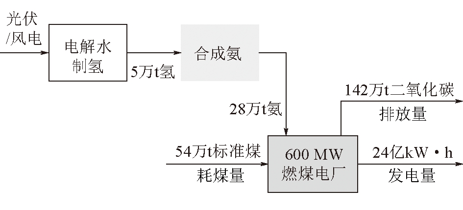 图3 基准方案+“蓝氨” 2.4 情景四:基准方案+“绿氨”情景四是在情景一基准方案的基础上,通过掺烧按热值计25%的“绿氨”来实现25%的二氧化碳的减排率。情景四的基本说明如下:“绿氨”是区别于传统煤制合成氨生产工艺,是以新能源电解水制氢再合成氨,主要包括空气分离、新能源发电、电解水制氢、氨合成等工艺单元。新能源制氢合成氨系统相较于传统工艺最大的优势在于降低碳排放,同时可消纳不稳定的新能源电力,将其转化为稳定的便于存储的形式。 电解制氢的电力由光伏发电提供,光伏电价参照当前市场成本水平0.15元/(kW·h)计算,考虑技术进步后光伏电价下降为0.08元/(kW·h)。研究分析中暂不考虑光伏制氨对系统发电效率的影响。通过对计算结果的分析,可以得出以下几点。 (1)相较“蓝氨”,“绿氨”掺烧不影响系统能量效率。相比传统煤制氨生产工艺,新能源电解水制氢合成氨过程不额外消耗化石能源,掺烧25%“绿氨”后整体系统发电效率不受影响。 (2)从全过程角度看,掺烧“绿氨”将会降低系统碳排放。对于基准设定600 MW燃煤机组,替代25%燃料煤需要氨约28万t/a,这部分“绿氨”生产过程中不涉及二氧化碳排放,整体上评价边界内碳排放减少48万t。 (3)掺烧“绿氨”对煤电度电成本的影响低于“蓝氨”。在光伏电价0.15元/(kW·h)、当前电解水制氢装备投资及电耗水平下,合成氨生产成本约为2 800元/t左右。600 MW机组掺烧25%“绿氨”,折合度电成本将增加0.213元/(kW·h)。如若再考虑系统二氧化碳减排收益,度电成本减少0.010元/(kW·h)。即掺烧25%“绿氨”后,度电成本增加0.203元/(kW·h)。 (4)若考虑光伏发电进一步降本潜力,掺烧“绿氨”经济性将显著提升。随着光伏产业链各环节不断降本增效,光伏发电成本将进一步下降,当电价降为0.08元/(kW·h)时,在考虑碳减排收益时,“绿氨”情景最终将使度电成本增加0.067元/(kW·h),届时显著优于“蓝氨”情景。当光伏成本下降到0.07元/(kW·h)时,“绿氨”掺烧方案将与煤电燃烧后CCUS方案在成本方面相当。 (5)若考虑未来以弃风弃光电解水制氢制氨,掺烧“绿氨”经济性将更具竞争力。以当前内蒙古电力市场为例,保障小时数(1 200 h)以外光伏上网电价为0.055 7元/(kW·h),暂不考虑过网成本影响,绿氨情景下度电成本增加将由0.067元/(kW·h)进一步降至0.033元/(kW·h),比煤电燃烧后CCUS方案更具竞争力。