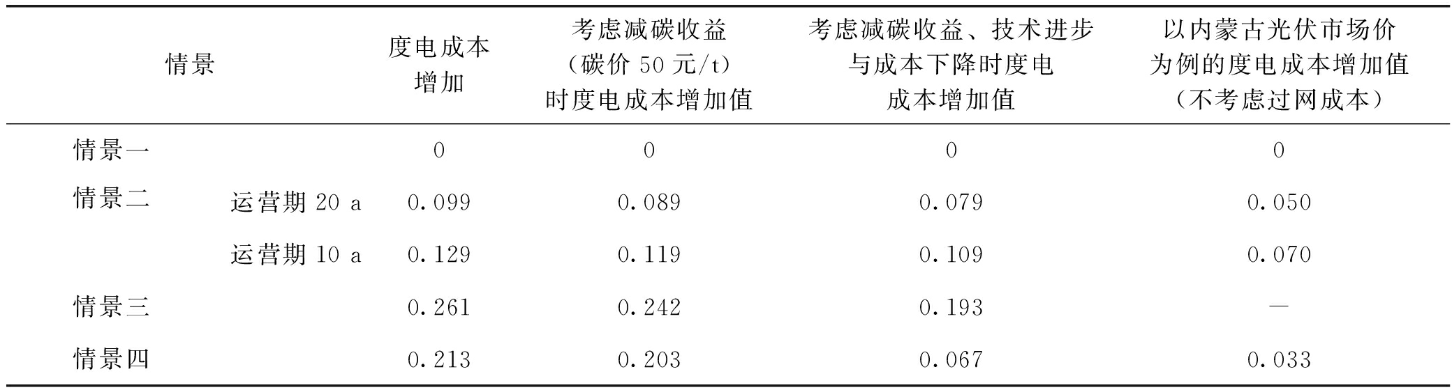 图4 基准方案+绿氨方案 不同燃煤掺氨情景下的燃煤电厂度电成本影响比较见表2,展示了3种不同二氧化碳减排方案与基准方案相比的度电成本增加情况。基于上述的计算和分析,从各种技术路线选择对燃煤电厂经济性影响来看,实现二氧化碳减排需要付出相应的经济成本和效率损失代价。在当前市场和技术水平下,燃煤混氨技术无论是采用煤制“蓝氨”,还是可再生能源制“绿氨”,与煤电燃烧后CCUS相比,对度电成本影响更大。 表2 不同燃煤掺氨情景下的燃煤电厂度电成本影响比较 元/(kW·h)