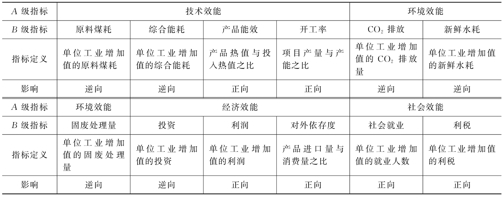 ★ 清洁利用 ★ 基于层次分析法的现代煤化工综合利用效能评估方法研究与建议能源是经济社会发展的物质基础和动力来源。自2021年9月以来,习近平总书记在能源企业考察调研时强调指出,富煤贫油少气是我国国情,要夯实国内能源生产基础,统筹抓好煤炭清洁低碳发展、多元化利用、综合储运这篇大文章,加快绿色低碳技术攻关,持续推动产业结构优化升级[1];煤化工产业潜力巨大、大有前途,要提高煤炭作为化工原料的综合利用效能,促进煤化工产业高端化、多元化、低碳化发展[2]。 现代煤化工是发挥煤炭原料属性的主要利用方式之一,目前技术种类繁多,而具体相关技术的综合利用效能评估研究较少。因此,基于我国现代煤化工的发展现状,建立现代煤化工综合利用效能评估指标体系,利用层次分析法对典型现代煤化工开展技术评估,并根据评估结果对我国未来煤化工的发展提出对策建议,可为现代煤化工产业的“高端化、多元化、低碳化”发展提供参考。 1 我国现代煤化工技术和产业发展现状经过近20年尤其是“十三五”时期的快速发展,我国现代煤化工技术发展水平和产业规模总体处于国际领先水平。以国家能源集团为代表的领军企业和中科院大连化物所为代表的科研院所开展联合攻关,开发了一系列具有自主知识产权的原创性技术,建成了一批重大科技示范工程,奠定了我国在全球煤化工产业的领先地位,为发挥我国煤炭资源优势、降低油气对外依存度、拓展石油化工原料来源开辟了新路径,为实现“将能源的饭碗牢牢端在手里[3]”提供了重要保障。 1.1 产业规模全球最大目前我国现代煤化工的产业规模是全球最大的。根据中国煤炭加工利用协会的初步统计数据,截至2021年底,我国煤制油总产能为931万t/a,与2020年相比无新增产能;在煤制天然气方面,总产能达到61.25亿m3/a,与2020年相比新增汇能二期煤制天然气项目1套,新增产能10.2亿m3/a;在煤(甲醇)制烯烃方面,总产能为1 672万t/a,与2020年相比无新增产能,煤(甲醇)制烯烃已成为石化烯烃的重要补充;在煤制乙二醇方面,总产能达到675万t/a,与2020年相比新增项目5套,新增产能186万t/a [4-7]。 1.2 技术水平国际领先经过近20年的技术攻关,我国现已形成较为完备的现代煤化工工程技术体系,关键设备国产化水平不断提高,大型煤气化技术、高温费托合成技术、煤制芳烃、低温费托合成、煤制乙二醇、煤油共炼技术均处于国际领先水平,煤直接液化、粉煤中低温热解及焦油轻质化技术属于国际首创[4-8]。以中科院大连化物所的甲醇制烯烃技术(DMTO)为例,最新的DMTO-Ⅲ技术通过中国石油和化学工业联合会鉴定,整体处于国际领先水平,其吨烯烃甲醇单耗达到2.85~2.90 t,单位烯烃成本较现有技术下降10%左右,技术优势明显,应用前景广阔[9]。 1.3 运行水平不断提高以国家能源集团鄂尔多斯百万吨级煤直接液化、包头60万吨级煤制烯烃和宁夏煤业400万吨级煤间接液化项目为代表的一系列重大科技示范工程不断完善工艺系统,资源利用水平不断提高,能效水平持续提升。高难度污水处理技术,高效酚氨回收,含酚废水、高盐水处理技术逐步完善,污染物治理技术水平持续提高。2021年受原油价格大幅上涨的影响,我国煤制油行业实现扭亏为盈[4-7]。同年,宁夏煤业400万吨级煤间接液化项目首次实现达产(设计产能405万t/a),装备材料国产化率达到98.5%,标志着全国最大的煤制油项目打通全部工艺流程,实现安全、稳定、长周期、满负荷的生产,并具备规模化发展的基础和条件[10]。 2 基于层次分析法的现代煤化工综合利用效能评价2.1 层次分析法由各类指标聚合而成的综合指标已成为衡量目标整体可持续性程度的主要手段。层次分析法提供了一个成熟的指标聚合执行框架,广泛应用于指标的加权。 层次分析法是将与决策相关的元素分解成目标、准则、方案等层次,在此基础上进行定性和定量分析,通过专家的判断,建立指标之间相对偏好的矩阵,从而揭示指标的权重大小。 首先,对每个矩阵进行一致性检验,通过式(1)计算矩阵的一致性指数(CI): (1) 式中:CI——一致性指数; λmax——矩阵的最大特征值; n——指标的数量,个。 通过计算一致性比率(CR)来检验两两比较的一致性,如式(2)所示: (2) 式中:CR——一致性比率; RI——平均随机一致性指标,当一致性比率小于0.1时,认为权重评估是合理的。 接着,通过式(3)计算第i位专家评估的第j个指标的权重αij: αij=Bij·Aij (3) 式中:Bij——第i位专家评估的第j个指标对应的B级的权重; Aij——第i位专家评估的第j个指标对应的A级的权重。 最后,通过式(4)计算专家评估的第j个指标的平均权重αj: (4) 2.2 评价对象现代煤化工是以气化、直接液化、甲醇制烯烃、热解等技术为源头,再利用不同形式的合成转化技术形成煤制清洁能源和煤制化学品的技术产业链。结合我国现代煤化工技术和产业发展现状,笔者选择煤直接液化、煤间接液化、煤制烯烃、煤制乙二醇等4种主流的现代煤化工技术作为研究对象,进行综合利用效能评价。 2.3 评价指标现代煤化工是技术密集型产业,技术效能评价尤为重要。此外,现代煤化工产业对于拉动地方经济、促进就业、维护社会稳定具有积极贡献,但对生态环境也有显著影响。因此,有必要考虑现代煤化工的环境、经济、社会效能。 参考笔者团队先前的工作[7],以技术效能、环境
