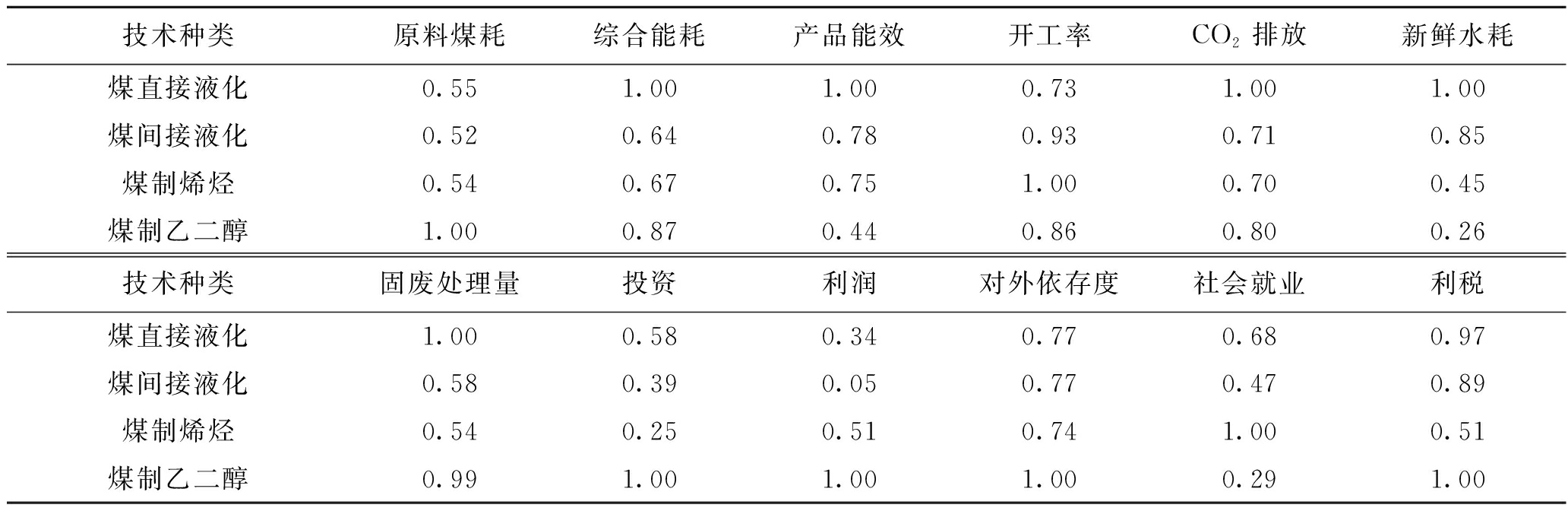 A级指标技术效能环境效能B级指标原料煤耗综合能耗产品能效开工率CO2排放新鲜水耗指标定义单位工业增加值的原料煤耗单位工业增加值的综合能耗产品热值与投入热值之比项目产量与产能之比单位工业增加值的CO2排放量单位工业增加值的新鲜水耗影响逆向逆向正向正向逆向逆向A级指标环境效能经济效能社会效能B级指标固废处理量投资利润对外依存度社会就业利税指标定义单位工业增加值的固废处理量单位工业增加值的投资单位工业增加值的利润产品进口量与消费量之比单位工业增加值的就业人数单位工业增加值的利税影响逆向逆向正向正向正向正向 2.4 指标数据来源与权重计算笔者通过调研,从国内现代煤化工相关企业、中国石油和化学工业联合会、国家统计局、国家能源局等单位获取数据,由于不同现代煤化工技术路线的产品有很大差异,对于部分量化指标,单位质量或能量产品无法作为对比的基准。 鉴于不同产品皆具有商品属性,本研究采用单位工业增加值作为指标对比的基准。工业增加值、利税与利润取值以60美元/桶的国际油价为基准,所有指标采用最为常用的比例法标准化各指标数据[11],指标标准化(无量纲化)后数值见表2。 表2 指标标准化(无量纲化)后数值