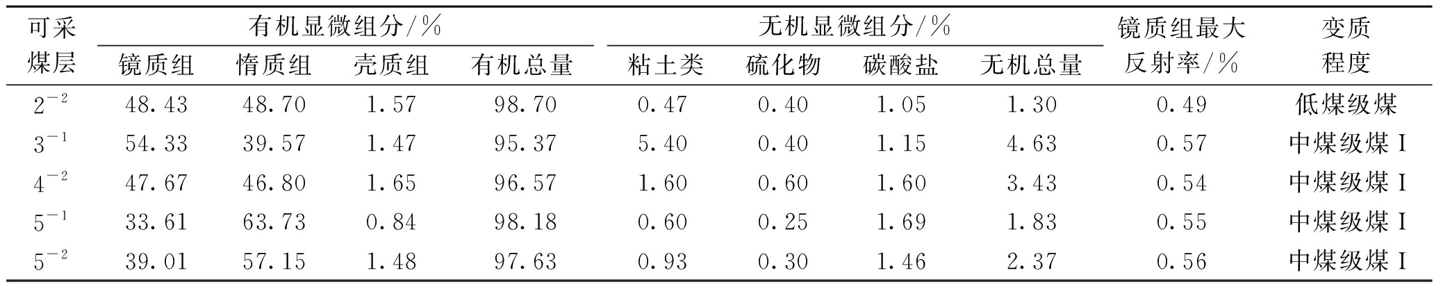 陕北庙哈孤矿区煤质特征及清洁利用方向研究煤炭是我国的主要能源和重要的工业生产原料,但在推动我国经济发展的同时,也带来了一系列生态环境问题[1-3]。在“双碳”目标下,环保要求日益严格,能源结构调整和生态环境保护的双重压力,促使煤炭清洁高效利用成为煤炭行业发展的必由之路[4-5]。煤炭在化学转化中,不同工艺对煤质有不同的要求,因此系统研究煤岩煤质特征是划分煤炭洁净等级的基础,也是煤炭清洁高效利用的重要依据。 陕北侏罗纪煤田是我国西北地区重要的煤炭基地,煤炭资源丰富且煤质优良,具有低灰、低硫、高发热量、高含油等特点[6-8]。庙哈孤矿区位于陕北侏罗纪煤田东北边缘地区,由于其处于煤田的边缘地带,与神府、榆神、榆横矿区相比,受重视程度并不高,因此对该区煤岩煤质特征的研究较少,也未对其清洁利用潜力及方式进行过系统研究。为了充分利用煤田边缘的煤炭资源,优化煤炭资源开发利用的方式,以庙哈孤矿区可采煤层为研究对象,以煤化工利用为目的对其煤岩煤质特征进行分析,并评价其洁净利用等级、探讨其清洁利用方向,可为该区煤炭资源清洁高效利用提供依据。 1 地质概况庙哈孤矿区行政区划隶属府谷县庙沟门镇、哈镇、孤山镇管辖,该区属于伊陕斜坡东北边缘侏罗纪沉积区[9],矿区南部地区主体为向SW倾斜的单斜构造,倾角1°~3°,局部发育为宽缓的波状起伏;北部地区发育近东西向、宽4~5 km的狭长断陷带,区内尚未发现岩浆活动迹象。含煤地层为侏罗系中统延安组,共含煤9层,自上而下编为2-2、3-1、4-2、4-3、4-4、5-1、5-2上、5-2、5-3号煤层,可采煤层5层,分别为2-2、3-1、4-2、5-1、5-2号煤层,可采煤层厚度均值为1.71~3.67 m,以中厚-厚煤层为主,煤层结构简单,发育稳定。 2 煤岩煤质特征2.1 煤岩特征庙哈孤矿区可采煤层煤岩成分以暗煤、亮煤为主,夹镜煤条带或透镜体。宏观煤岩类型以半暗煤为主,半亮煤次之。显微煤岩组成中有机显微组分含量较高,平均含量为95.37%~98.70%。其中,镜质组均值为33.61%~54.33%,惰质组均值为39.57%~63.73%,壳质组均值为0.84%~1.65%,镜惰比均值为0.54~1.47。根据李小彦[10]关于富惰质组煤的划分方案(惰质组含量大于30%、镜惰比小于2为富惰质煤)判断,认定庙哈孤矿区可采煤层属于富惰质组煤。各煤层无机显微组分含量较低,平均含量为1.30%~4.63%。以碳酸盐类为主,均值为1.05%~1.69%;其次为粘土类,均值为0.47%~5.40%;硫化物少量,均值为0.25%~0.60%。各煤层煤化程度较低,镜质组最大反射率均值为0.49%~0.57%,属0-I级变质阶段,为低煤化度烟煤,可采煤层煤岩鉴定成果见表1。 表1 可采煤层煤岩鉴定成果