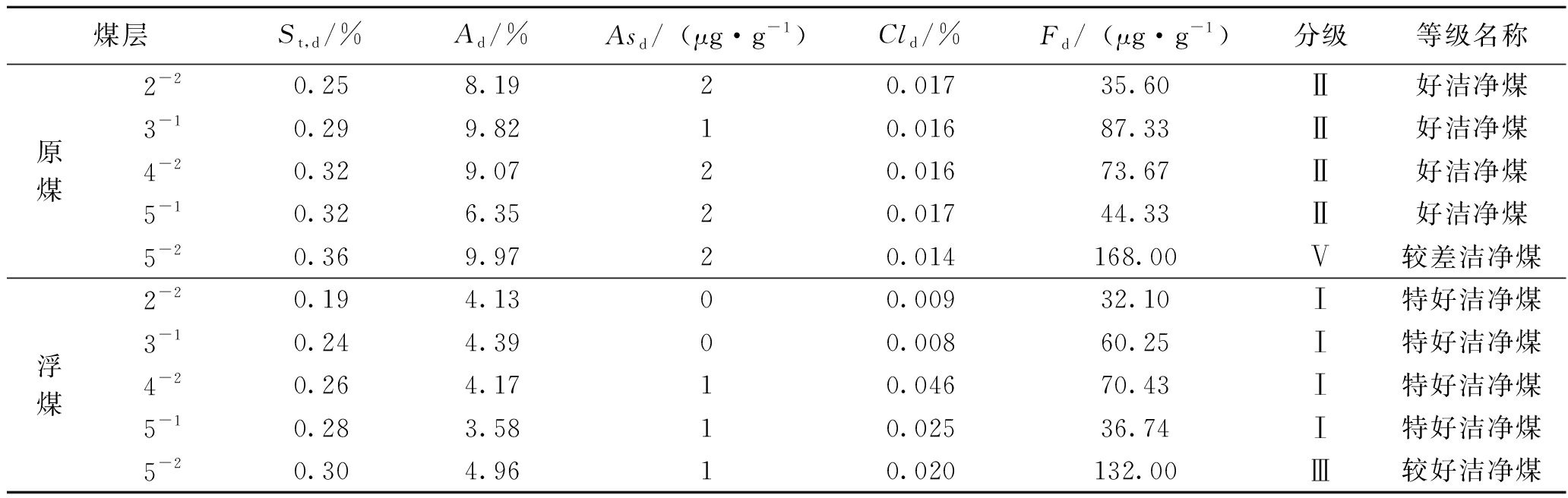 分级等级名称St,d/% Ad /%Asd/(μg·g-1)Cld /%Fd /(μg·g-1)Ⅰ特好洁净煤0.5540.050 0 80Ⅱ好洁净煤1.01060.078 2 100Ⅲ较好洁净煤1.520100.122 5 126Ⅳ中等洁净煤2.030160.191 7 159Ⅴ较差洁净煤3.040250.300 0 200Ⅵ差洁净煤4.550400.469 0 251 当各指标的洁净等级不一致时,采取“就低不就高”的原则,以评级等级差者为准,庙哈孤矿区洁净煤潜力见表3。 表3 庙哈孤矿区洁净煤潜力