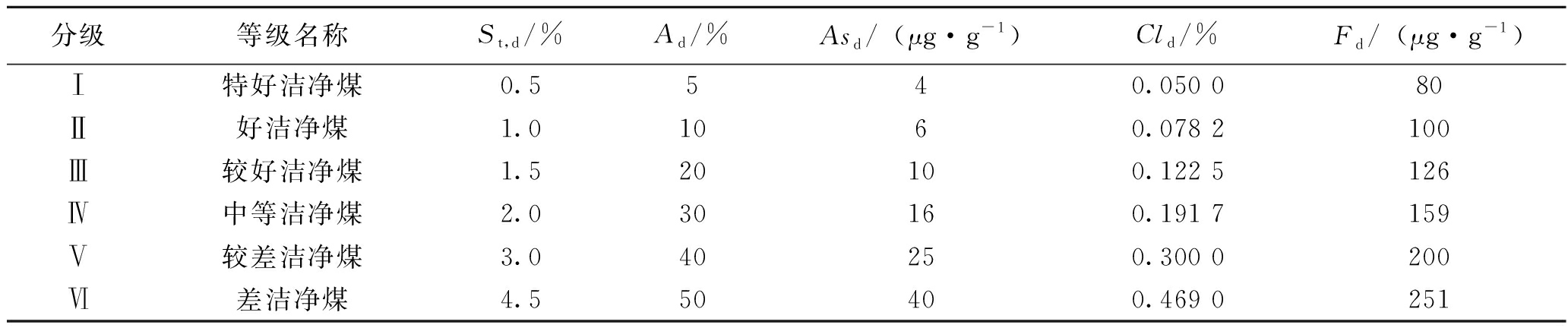 可采煤层有机显微组分/%镜质组惰质组壳质组有机总量无机显微组分/%粘土类硫化物碳酸盐无机总量镜质组最大反射率/%变质程度2-248.4348.701.5798.700.470.401.051.300.49低煤级煤3-154.3339.571.4795.375.400.401.154.630.57中煤级煤I4-247.6746.801.6596.571.600.601.603.430.54中煤级煤I5-133.6163.730.8498.180.600.251.691.830.55中煤级煤I5-239.0157.151.4897.630.930.301.462.370.56中煤级煤I 2.2 化学性质(1)水分(Mad)。各可采煤层水分含量均值为8.88%~9.43%,属低水分煤。经过选煤处理后,浮煤水分含量均值为3.53%~6.78%。相比原煤,水分含量有所降低。 (2)灰分(Ad)。各可采煤层原煤灰分产率均值为6.35%~9.97%,属特低灰分煤,经过选煤处理后,浮煤灰分产率均值为3.58%~4.96%。相比原煤,灰分产率均有不同程度的降低。 (3)挥发分(Vdaf)。各可采煤层原煤挥发分产率均值为34.64%~37.42%,属中高-高挥发分煤,其中3-1、4-2号煤层为高挥发分煤,2-2、5-1、5-2号煤层为中高挥发分煤。浮煤挥发分产率均值为34.21%~37.30%。相比原煤,挥发分产率有所降低,但变化较小。 (4)硫分(St,d)。各可采煤层原煤全硫主要以硫化铁硫和有机硫为主,经选煤处理后,浮煤中的硫化铁硫含量有所降低,硫酸盐硫和有机硫与原煤相比变化不大。原煤全硫含量均值为0.25%~0.36%,总体上各煤层原煤全硫含量差别不大,含量均较低,均属特低硫煤,经选煤处理后,浮煤全硫含量比原煤有所降低,均值为0.19%~0.30%。 (5)氢碳原子比(H/C)。各可采煤层原煤氢碳原子比均值为0.63~0.69,浮煤氢碳原子比均值为0.66~0.72。 2.3 工艺性能(1)发热量(Qgr,d)。各可采煤层原煤干燥基高位发热量均值为27.99~30.36 MJ/kg,依据《煤炭质量分级 第3部分:发热量》(GB/T 15224.3-2010)标准,各煤层均为高发热量煤。 (2)煤灰熔融性。各可采煤层的煤灰熔融性软化温度(ST)均值为1 158~1 243 ℃。按照《煤灰软化温度分级》(MT/T 853.1-2000)标准,各煤层以较低软化温度灰为主。煤灰熔融性流动温度(FT)为1 179~1 284 ℃。按照《煤灰流动温度分级》(MT/T 853.2-2000)标准,各煤层灰融点较低。 (3)黏结指数(GRI)。各可采煤层黏结性指数均为0,按照《烟煤黏结指数分级》(MT/T 596-2008)标准,各煤层均为不黏煤。 (4)哈式可磨性指数(HGI)。各可采煤层原煤哈氏可磨性指数均值为49~69,按照《煤的哈氏可磨性指数分级》(MT/T 852-2000)标准,除2-2号煤层为中等可磨煤外,其他煤层均为较难磨煤。 (5)热稳定性(TS+6)。各可采煤层热稳定性指标均值为60.07%~74.50%。根据《煤的热稳定性分级》(MT/T 560-2008)标准,各煤层均属中-中高热稳定性煤。 (6)煤对二氧化碳的反应性(α)。在950 ℃时,煤对二氧化碳的反应性均值为53.40%~64.0%,各可采煤层在950 ℃时煤对二氧化碳的反应性良好。 2.4 有害元素(1)氯。各可采煤层原煤氯含量(Cld)均值为0.014%~0.017%,浮煤氯含量均值为0.008%~0.046%,按照《煤中有害元素含量分级 第2部分:氯》(GB/T 20475.2-2006)分级标准,各煤层均属特低氯煤。 (2)氟。各可采煤层原煤氟含量(Fd)均值为35.6~168.0 μg/g,浮煤氟含量均值为32.1~132.0 μg/g,按照《煤中有害元素含量分级 第5部分:氟》(GB/T 20475.5-2020)分级标准,各煤层均属特低氟-低氟煤,其中5-2号煤层为低氟煤,其他煤层均属特低氟煤。 (3)砷。各可采煤层原煤砷含量(Asd)均值为1~2 μg/g,浮煤砷含量均值为0~1 μg/g,按照《煤中有害元素含量分级 第3部分:砷》(GB/T 20475.3-2012)分级标准,各煤层均属特低砷煤。 3 庙哈孤矿区煤类与洁净等级划分3.1 煤类根据《中国煤炭分类》(GB/T 5751-2009)标准,煤类以表征煤化程度的浮煤干燥无灰基挥发分产率(Vdaf)和黏结性指数(GR.I.)以及辅助分类指标透光率(PM)确定。庙哈孤矿区各可采煤层黏结指数均为0,透光率均大于50%,因此煤类主要依据干燥无灰基挥发分来划分,除3-1号煤层浮煤挥发分产率大于37%、为长焰煤41号(CY41)外,其他2-2、4-2、5-1、5-2号煤均为不黏煤31号(BN31)。 3.2 洁净等级划分煤炭洁净等级划分是煤炭质量评价的基础,也是煤炭绿色、清洁、高效利用的依据之一。根据唐书恒等[11]研究人员提出的洁净煤潜力评价方法,结合庙哈孤矿区可采煤层的煤质特征及煤炭清洁利用的相关指标,选取灰分(Ad)、硫分(St,d)、砷含量(Asd)、氯含量(Cld)及氟含量(Fd)5个评价因子进行洁净等级划分,洁净等级划分方案及评价因子见表2。 表2 洁净等级划分方案及评价因子