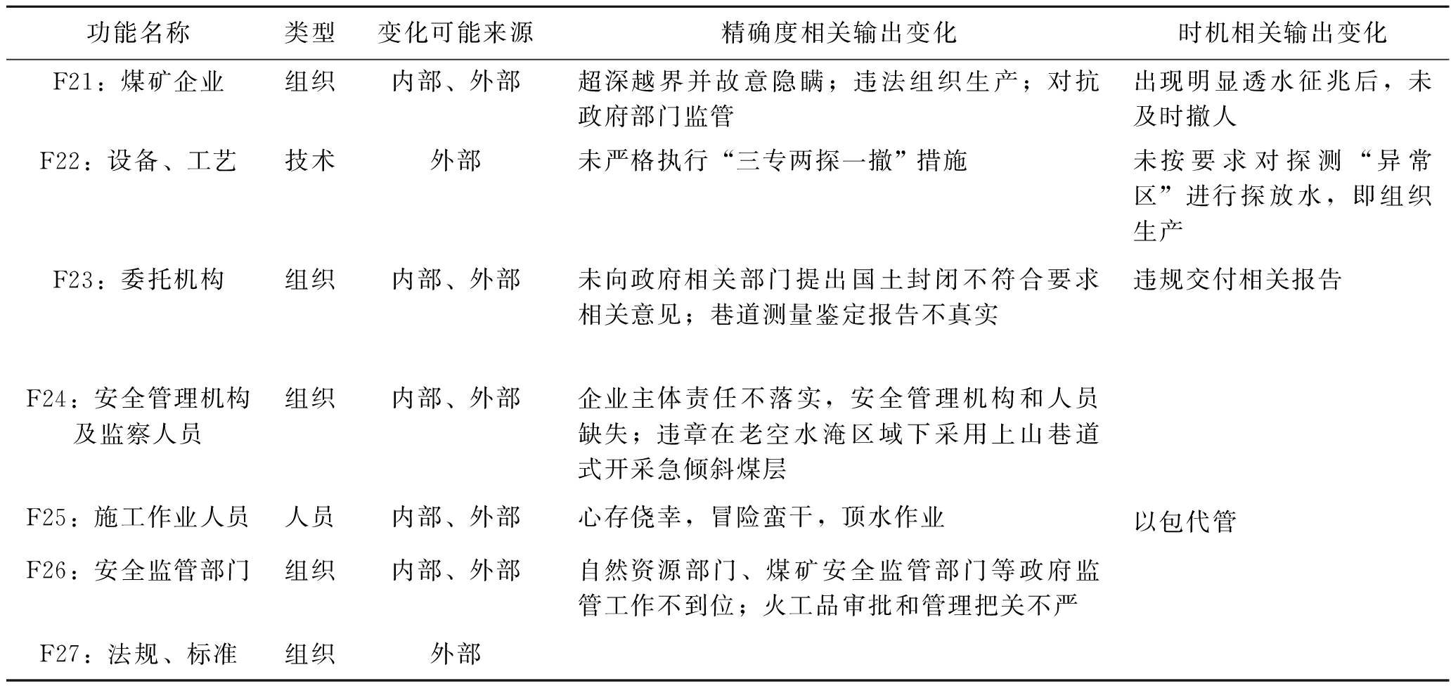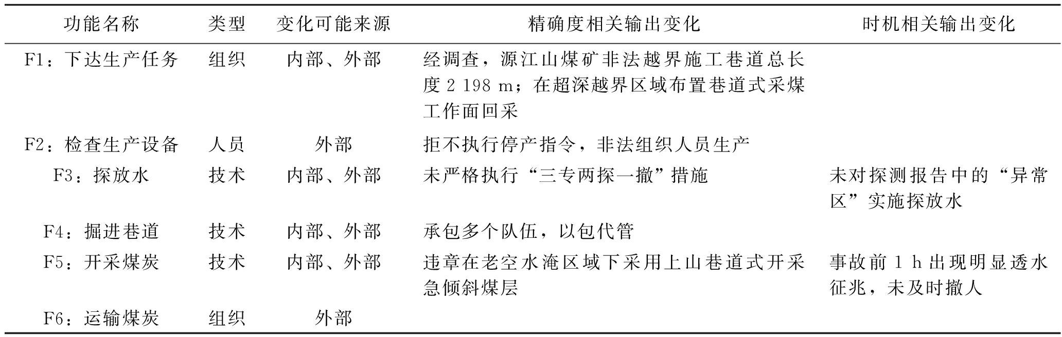 图1 生产系统S1功能模型 3.2 识别耦合变化,确定功能共振为了从技术上对煤矿水害事故进行功能共振分析,本文以源江山煤矿透水事故为例,采用功能共振模型对于系统中各项功能的实际功能类型、功能发生变化的内外部来源、精确度相关输出变化、时机相关输出变化等4项指标进行综合评估,得出事故系统中功能输出的变化性,为更具体表现功能发生的实际变化,对于精确度及时机变化指标采用更详细的叙述,参考事故调查报告内容对事故中实际发生的变化进行提炼总结。源江山煤矿事故的功能输出变化见表1。 表1 源江山煤矿事故S1系统功能输出变化