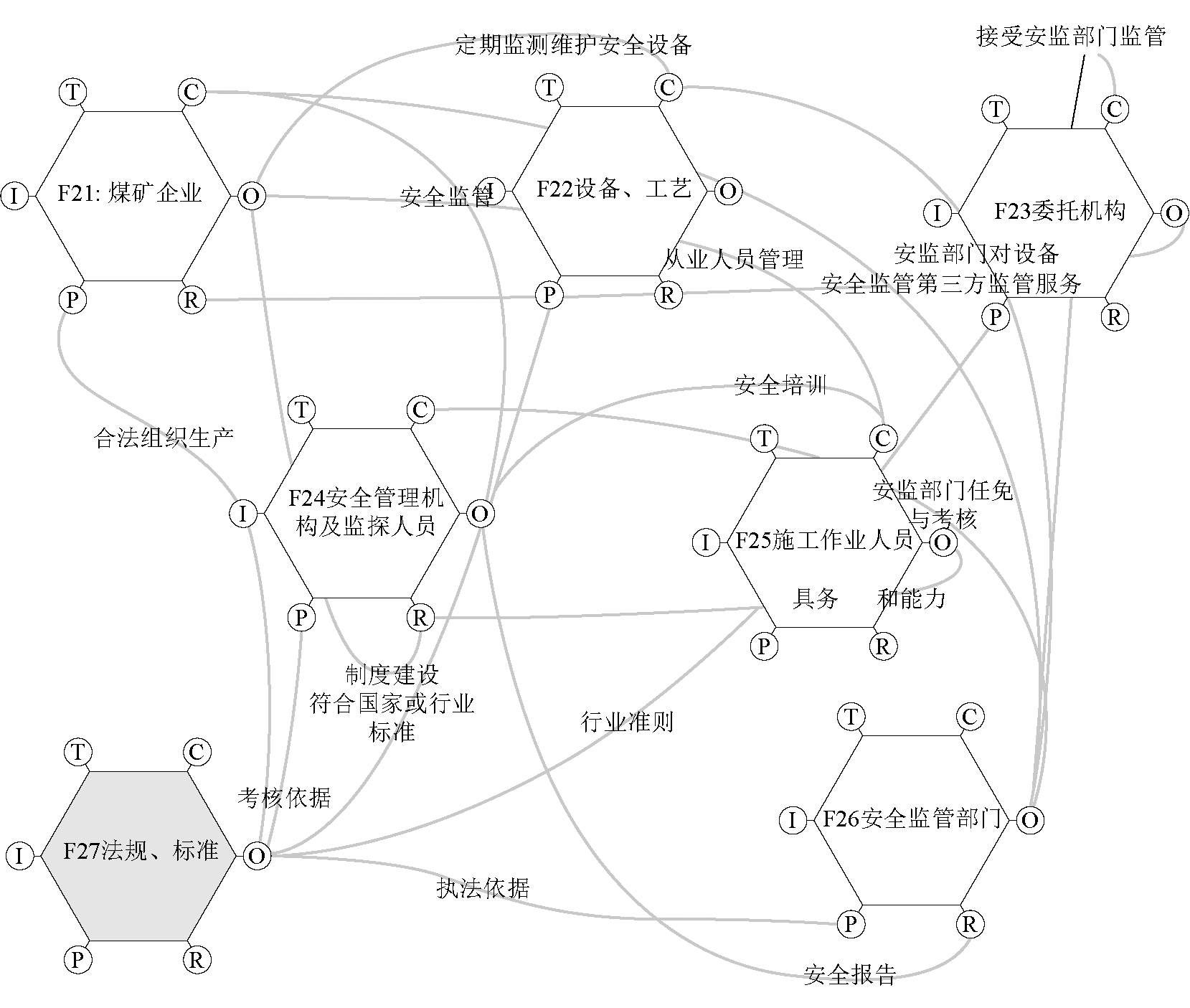 4 从管理角度进行功能共振分析4.1 识别系统基本功能从事故的生产安全责任角度出发,依据《安全生产法》,得到生产系统正常运行所需基本功能要素并辨识其功能[9-10],建立正常生产活动系统S2。构成S2系统的基本功能包括:煤矿企业(F21),设备、工艺(F22),委托机构(F23),安全监管机构及监察人员(F24),施工作业人员(F25),安全监管部门(F26),法规、标准(F27)。 生产系统S2功能模型如图2所示。