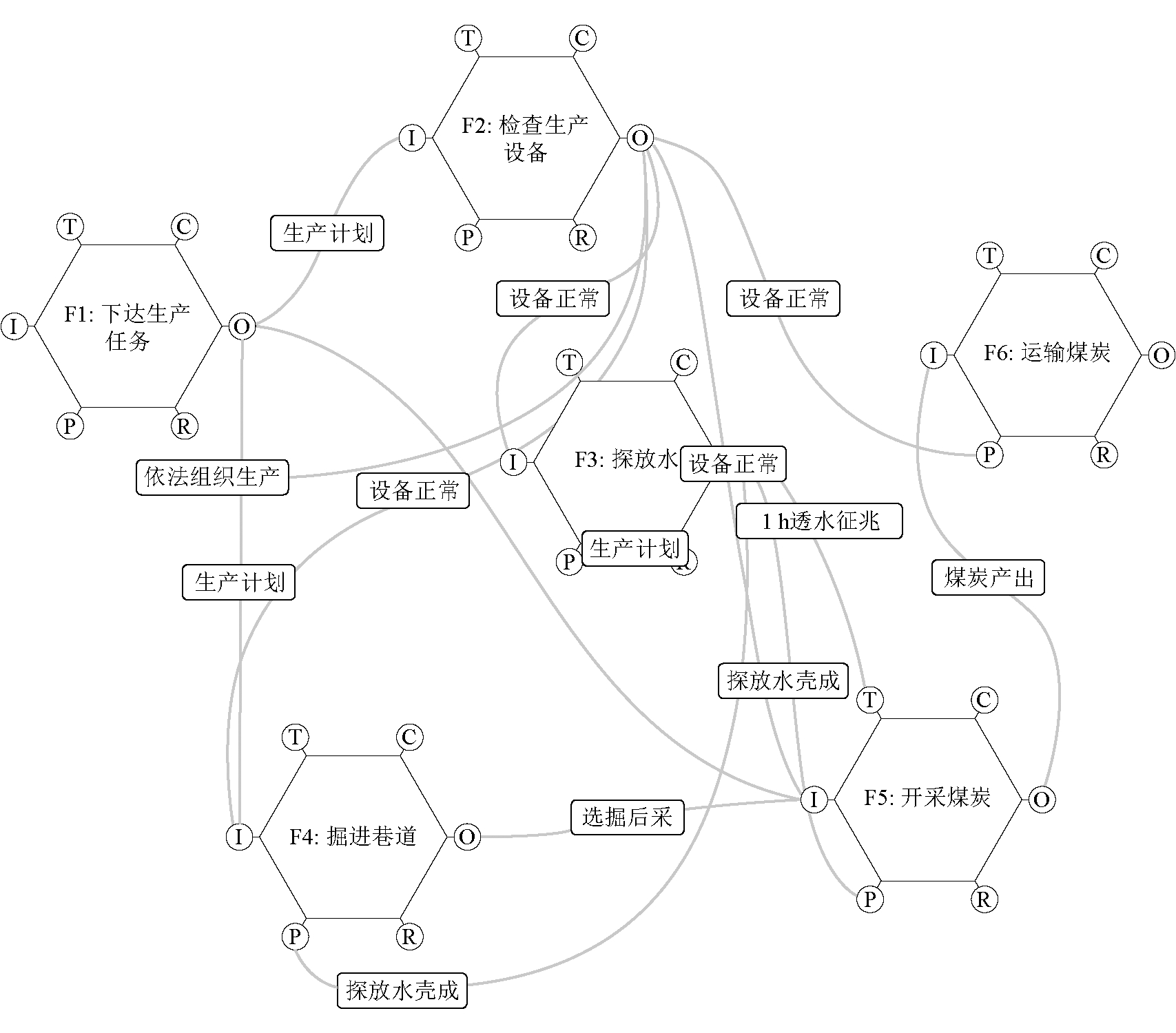 图2和表4可以从系统结构的角度体现上、下游功能之间的耦合关系,一项功能若在事故中表现出较大变化,则认为在生产系统正常运行中功能出现问题,导致事故发生。F21“煤炭企业”超层越界、非法组织开采,其输出导致F22、F24、F25都发生失效,这说明煤矿企业对于生产工艺、设备、企业内部安全监管和从业人员施工作业都出现较大问题。F23“委托机构”和F24“安全监管机构及监察人员”的失职也导致相关功能失效。F26“安全监管部门”发生失效较多,反映出安全监管部门在日常生产监督检查中对企业违法行为没有有效管控,对第三方机构监管不严,在此次事故中输出链接对事故产生巨大影响。 5 制定屏障措施从技术和管理两个角度,识别系统功能并评估各功能的耦合变化,设置屏障措施来防止功能失效,降低事故发生的可能性。 我国煤炭赋存特点决定了煤矿生产条件比较复杂,煤炭企业作为责任主体,是管理环节的源头,要严格依法组织生产,这是生产系统安全运行的前提。要加大对中介机构的监管力度,很多第三方机构对于生产现场的评估检测敷衍了事,甚至出具虚假报告,导致现场施工情况不明或者违法施工。而煤矿行业正因为其高危险性,才更应重视安全检查的过程和结果,加大检查的力度,因此提高安全检查人员的职业道德素养尤为重要。除此之外,还需有政策驱动,使检查人员对其检查结果负责并进行追踪。从安全监管的角度来看,企业监管部门和政府监管机构都要充分发挥作用,落实明察暗访等专项检查措施,坚决制止超深越界,严格监管执法,增加企业违法成本,可有效控制功能失效链接。从技术角度来讲,严格遵守《安全生产法》《煤矿安全规程》《煤矿防治水细则》等各项法律法规和规章制度,按规定设置防治水机构、配备专业技术人员和专用探放水设备,按照地质勘探和探放水有关要求,严格执行“三专两探一撤”措施,也可有效屏障失效链接。 6 结语煤矿水害事故原因错综复杂,通过运用功能共振分析方法,可有效对复杂系统事故原因进行分析。从技术和管理两个角度分别构建FRAM模型,可以更好地分析影响生产系统正常运行的因素。研究表明,FRAM模型与煤矿透水事故分析契合度较高,分析失效链接可以很好地解释上下游功能之间的耦合关系,体现生产系统中动态性和非线性特征。通过分析影响系统正常运行的失效链接,有针对性地制定屏障措施,可以有效避免生产系统功能失效共振导致事故发生,对控制煤矿水害事故具有一定的理论和现实意义。 [1] 李芳玮.煤矿水害事故分析与防治对策研究[J].中国煤炭,2022,48(5):14-19. [2] HOLLNAGELE.Barriers and Accident Prevention [M].New York: Ashgate Publishing,2004:48-50. [3] 王仲.功能共振分析方法在事故分析中的改进应用[D].北京:中国地质大学(北京),2017. [4] 张晓全,吴贵锋.功能共振事故模型在可控飞行撞地事故分析中的应用[J].中国安全生产科学技术,2011,704:65-70. [5] 崔铁军,马云东.考虑人因失误和状态检修的事故链式模型研究[J].中国安全科学报,2014,24(8):37-42. [6] 段钊.基于FRAM的国家安监局安全监管职能研究[D].北京:中国地质大学(北京),2017. [7] 冯珺妍,蔡爽,吴弘飞,等.基于FRAM的轨道交通系统调度岗位安全职责分析[J].安全,2021,42(8):57-64. [8] 张靖雯,马晓雪,刘阳,等.基于FRAM-FAHP法的船舶碰撞事故致因分析[J].安全与环境工程,2021,28(1):29-34. [9] 樊运晓,李冰怡,云霞皓月.基于FRAM的天津港“8·12”事故致因分析[J].安全, 2019,40(9):51-55. [10] 李冰怡.基于功能共振分析方法的我国近年特大事故致因分析[D].北京:中国地质大学(北京),2019. Analysis of water inrush accident in coal mine based on functional resonance