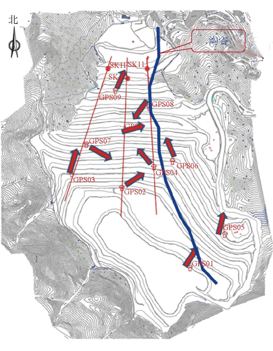 普阳煤矿1号排土场目前已建立了国内先进的边坡三维立体监测系统。监测系统包括地表位移自动监测系统、地下位移自动监测系统。1号排土场建立了13个排土场边坡动态监测点,其中10个地表位移自动监测点(GPS01、GPS02、GPS03、GPS04、GPS05、GPS06、GPS07、GPS08、GPS09、GPS10),3个深部位移监测点(SK10、SK11、SK12)。1号排土场监测系统布置如图2所示。对监测数据进行处理得到普阳煤矿1号排土场边坡位移监测点位移轨迹见表1。