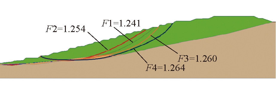 根据全基岩内疏水隧洞方案,1号排土场综合治理后,边坡稳定系数将得到提高,不同疏干效果情况下边坡稳定系数不同,疏水70%、80%、90%和100%时的现状边坡简化Bishop法边坡稳定计算结果分别为1.241、1.254、1.260、1.264,如图10所示。在边坡达到预计的疏水效果的情况下(排土场底部基本不积水,疏水效果100%时),现状边坡稳定系数可达到1.264,排土场在继续排土至1 100水平的情况下,边坡稳定系数为1.208。即排土场在采取综合治理措施后,疏水效果理想的情况下边坡稳定系数能达到规范规定要求,可以继续排土2 100万m3至1 100水平。