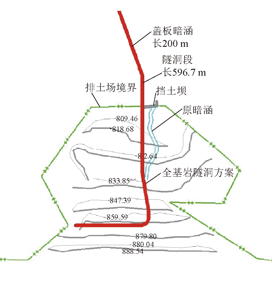 本方案有利于收集、排除排土场地下水,工程地质条件良好,隧洞全部位于中风化基岩中,位于潜在滑动面下,不小于7.12 m,隧洞不受排土场变形、滑坡的影响,隧洞支护简单、施工较容易、施工工期较短、投资少。经综合考虑研究,推荐全基岩疏水隧洞方案。