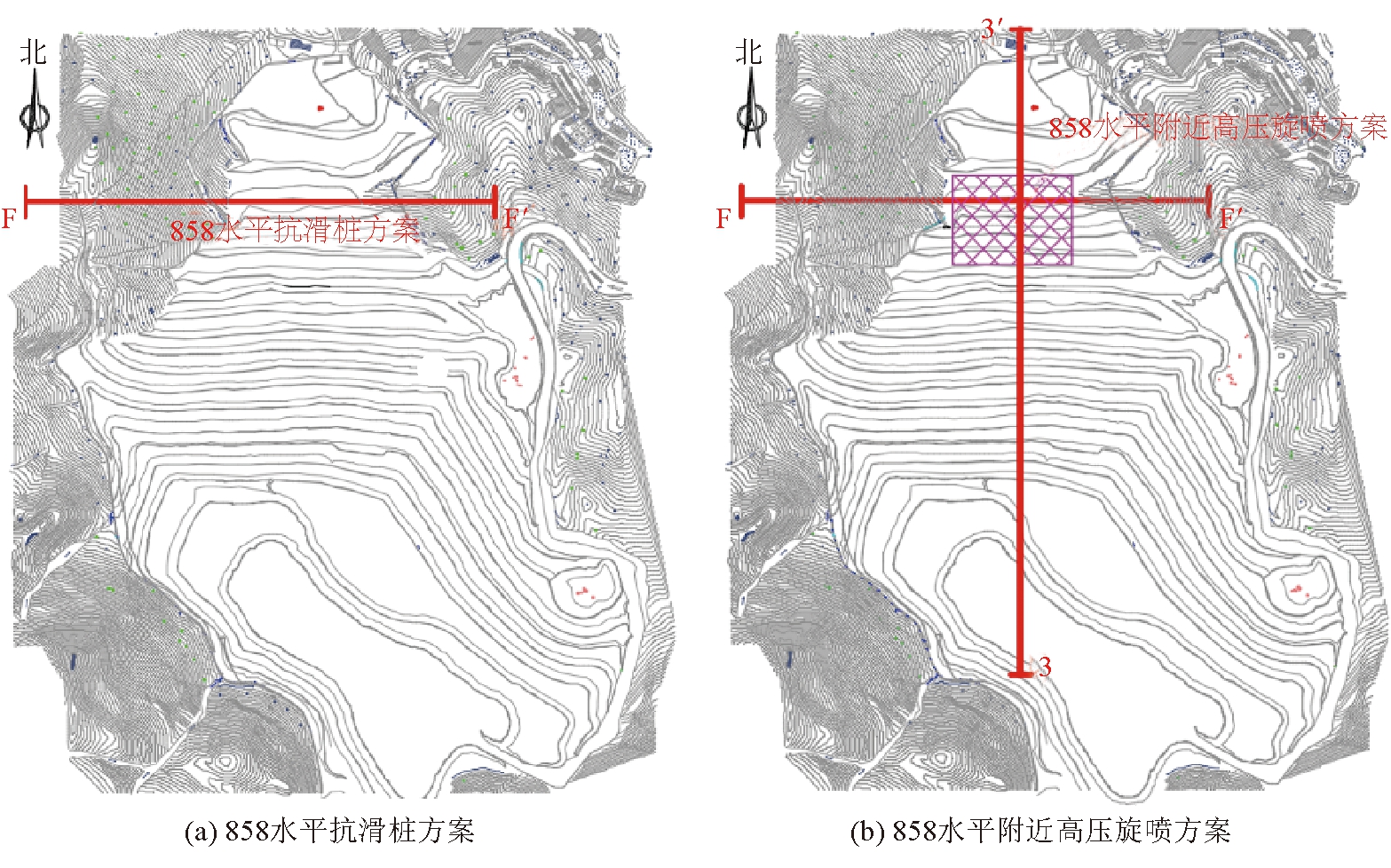 抗滑桩最大长77 m,远远超出规范及现有施工经验。虽然858水平高压旋喷桩方案弥补了抗滑桩施工难度大的问题,但是高压旋喷桩治理措施实施后会造成其地形上游方向出现地下水聚积,抬升上游地下水位标高,实施的时候必须采取相应的排水措施。考虑到858水平附近高压旋喷桩方案工程投资巨大,矿山难以承受,因此,不推荐858水平附近高压旋喷桩方案进行边坡治理。