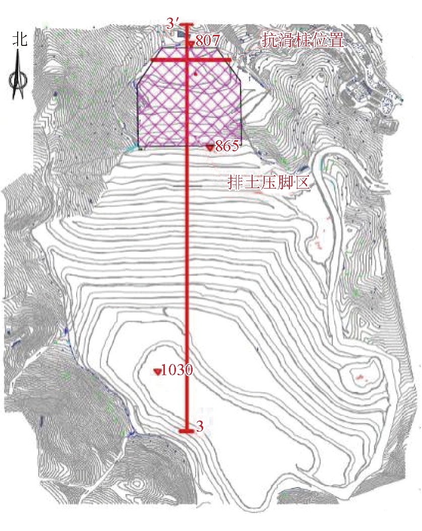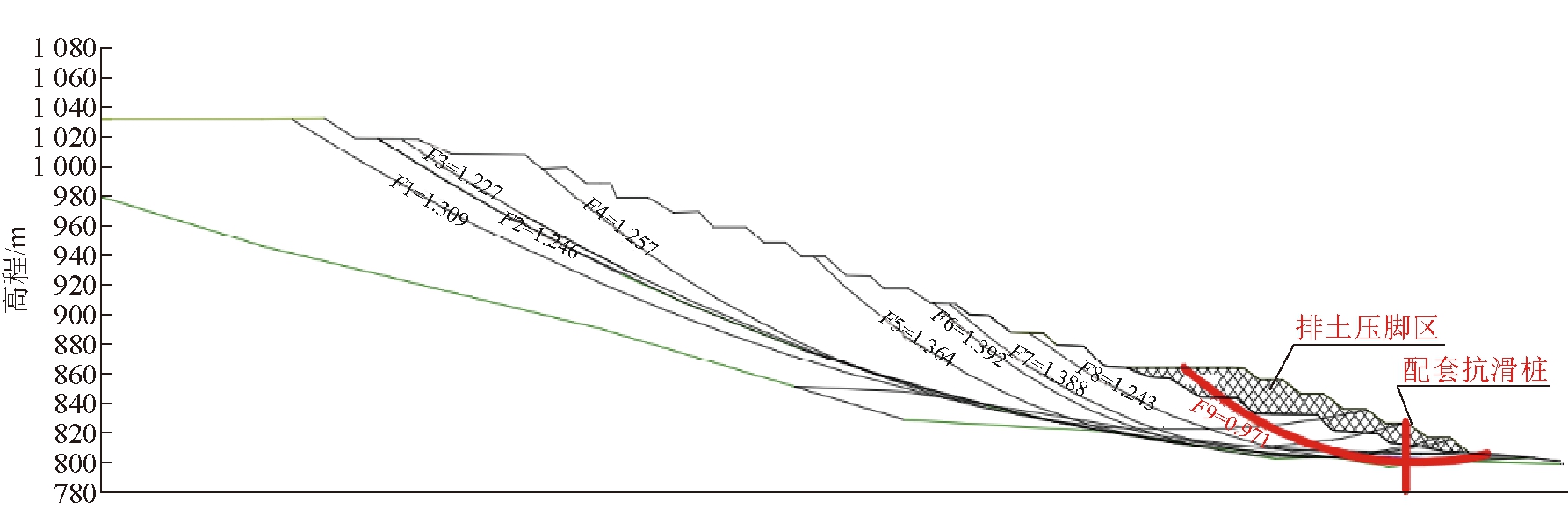 排土场边坡稳定系数较低的原因是排土场下部岩体软弱,抗滑能力不足。将矿山剥离强度较高的灰岩、泥灰岩用于排土场底部压脚,有利于边坡稳定。排土压脚及抗滑桩平面位置如图7所示。方案在压脚123万m3的情况下,计算了8个滑动面,上部866~1 030台阶,边坡最小稳定系数由1.090增大至1.227,上部边坡稳定系数得到大幅提高,如图8所示。因为排土压脚增加了底部水平的下滑力,808~866水平边坡稳定系数降低,出现0.971的稳定系数,存在滑坡危险,为保障排土场底部边坡稳定需配套实施抗滑桩,抗滑桩平均桩长35 m,最大长度45 m,共49根,断面按2.5 m×3.5 m计算。