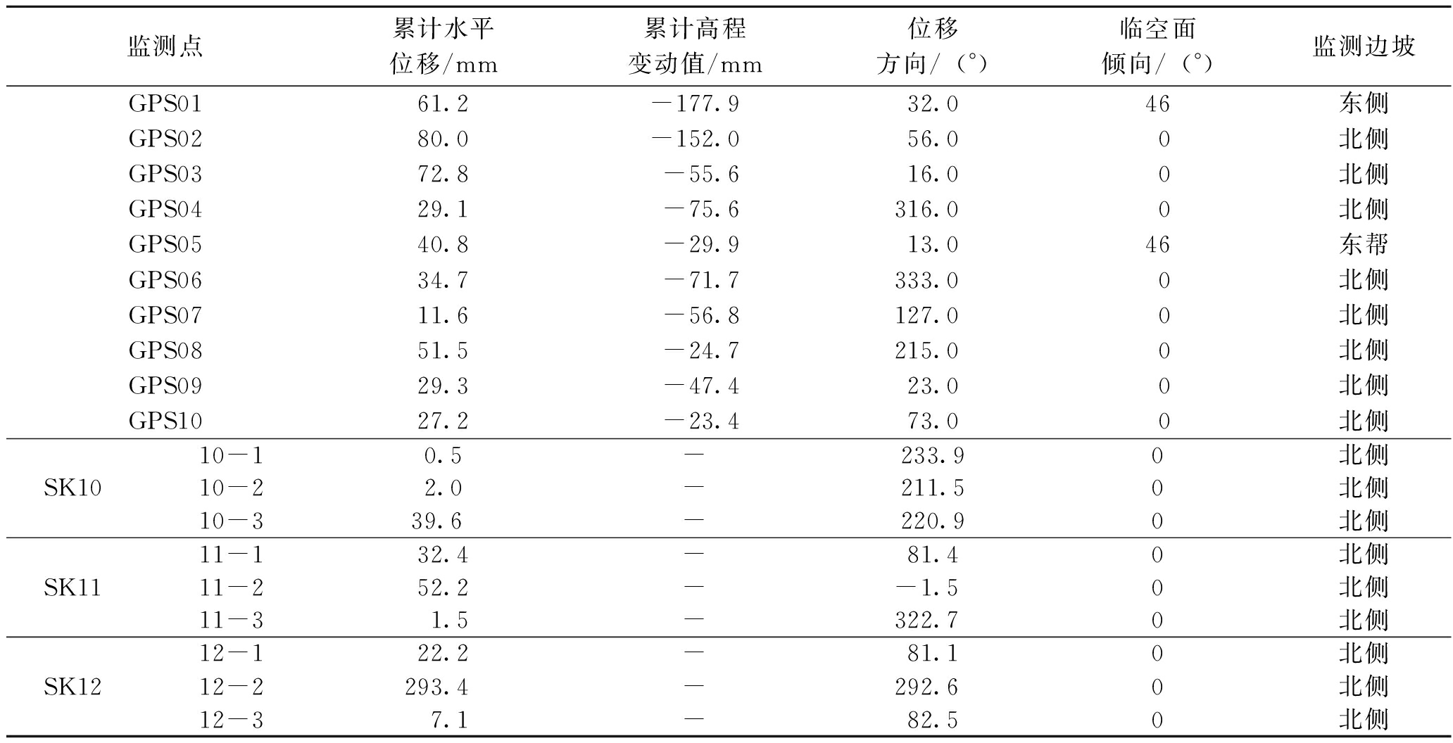监测点累计水平位移/mm累计高程变动值/mm位移方向/(°)临空面倾向/(°)监测边坡GPS0161.2-177.932.046东侧GPS0280.0-152.056.00北侧GPS0372.8-55.616.00北侧GPS0429.1-75.6316.00北侧GPS0540.8-29.913.046东帮GPS0634.7-71.7333.00北侧GPS0711.6-56.8127.00北侧GPS0851.5-24.7215.00北侧GPS0929.3-47.423.00北侧GPS1027.2-23.473.00北侧SK1010-10.5-233.90北侧10-22.0-211.50北侧10-339.6-220.90北侧SK1111-132.4-81.40北侧11-252.2--1.50北侧11-31.5-322.70北侧SK1212-122.2-81.10北侧12-2293.4-292.60北侧12-37.1-82.50北侧