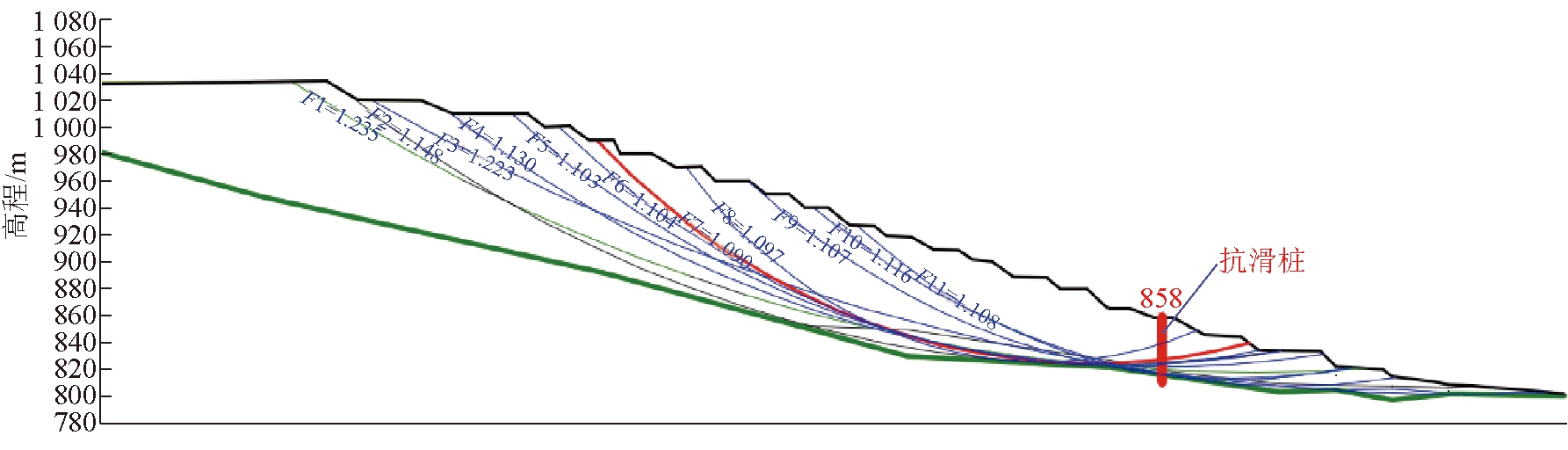 在边坡工程的滑坡治理中,采用抗滑桩穿过滑坡体深入基底,增加滑体的抗滑力,是提高边坡稳定性的常用方法。对于普阳煤矿1号排土场边坡,在858水平采用抗滑桩工程方案分为858水平抗滑桩方案和858水平高压旋喷桩方案,其方案布置情况如图5所示。本次设计采用简化Bishop法对3-3'剖面边坡稳定系数F提高至1.20时,858水平抗滑桩位置剩余下滑力进行了计算,经计算抗滑桩前的剩余下滑力为35 750 kN。858水平抗滑桩方案的滑面稳定验算结果如图6所示。