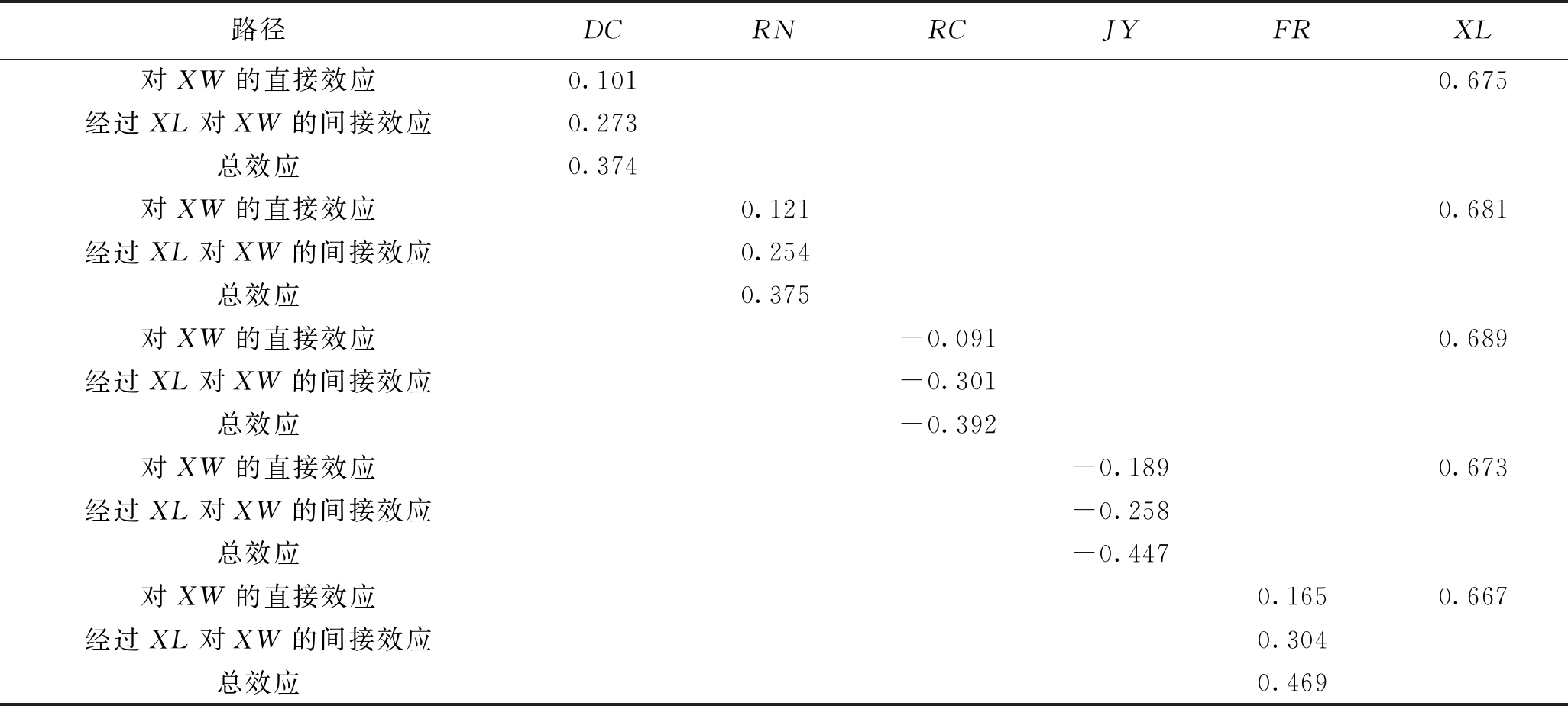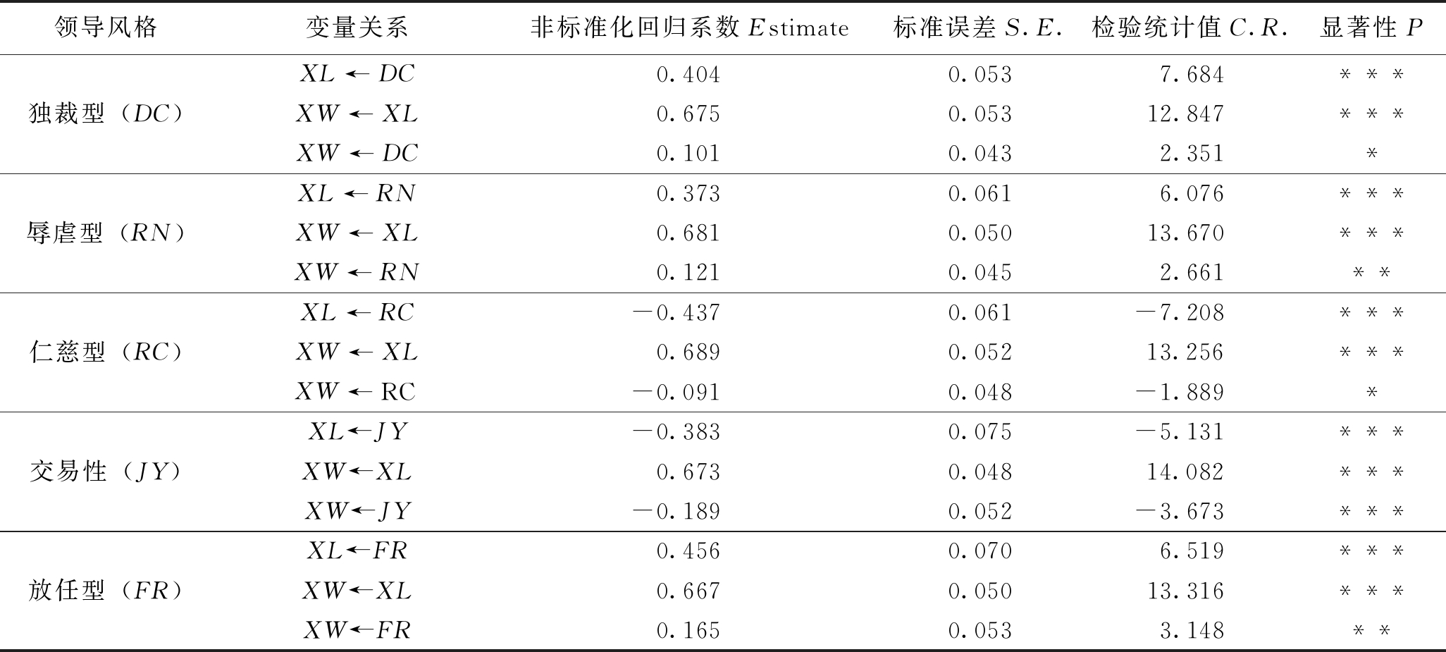 注:*表示P<0.05,**表示P<0.01,***表示P<0.001。 领导风格变量关系非标准化回归系数Estimate标准误差S.E.检验统计值C.R.显著性P独裁型(DC)XL←DC0.4040.0537.684***XW←XL0.6750.05312.847***XW←DC0.1010.0432.351*辱虐型(RN)XL←RN0.3730.0616.076***XW←XL0.6810.05013.670***XW←RN0.1210.0452.661**仁慈型(RC)XL←RC-0.437 0.061-7.208 ***XW←XL0.6890.05213.256 ***XW←RC-0.091 0.048-1.889 *交易性(JY)XL←JY-0.383 0.075-5.131 ***XW←XL0.6730.04814.082 ***XW←JY-0.189 0.052-3.673 ***放任型(FR)XL←FR0.4560.0706.519***XW←XL0.6670.05013.316***XW←FR0.1650.0533.148** 表2中介检验结果显示,矿工不安全心理(XL)分别在独裁型领导(DC)、辱虐型领导(RN)、仁慈型领导(RC)、交易型领导(JY)与放任型领导(FR)与矿工不安全行为关系中的中介效果均通过95%的显著性检验,因此中介效果良好。 表3的中介效应结果显示,在以独裁型领导风格为解释变量时,独裁型领导风格对矿工不安全行为的直接效应为0.101,通过加入不安全心理的中介变量后,独裁型领导风格对矿工不安全行为的间接效应为0.273,影响程度增加。同理,在以辱虐型领导风格为解释变量时,在加入矿工不安全心理中介变量前后,直接效应和间接效应分别为0.121、0.254,辱虐型领导风格也随着矿工不安全心理中介变量的加入,对矿工不安全行为的影响程度加深;在分别以仁慈型、交易型和放任型领导风格为解释变量时,影响效果均发生加强的效果,说明矿工不安全心理在安全管理者不同领导风格与矿工不安全行为的关系中具有部分中介效应,假设H4得到验证,并且随着矿工不安全心理中介作用的影响,安全管理者的不同领导风格对矿工不安全行为的影响会加强。 表3 中介效应汇总表