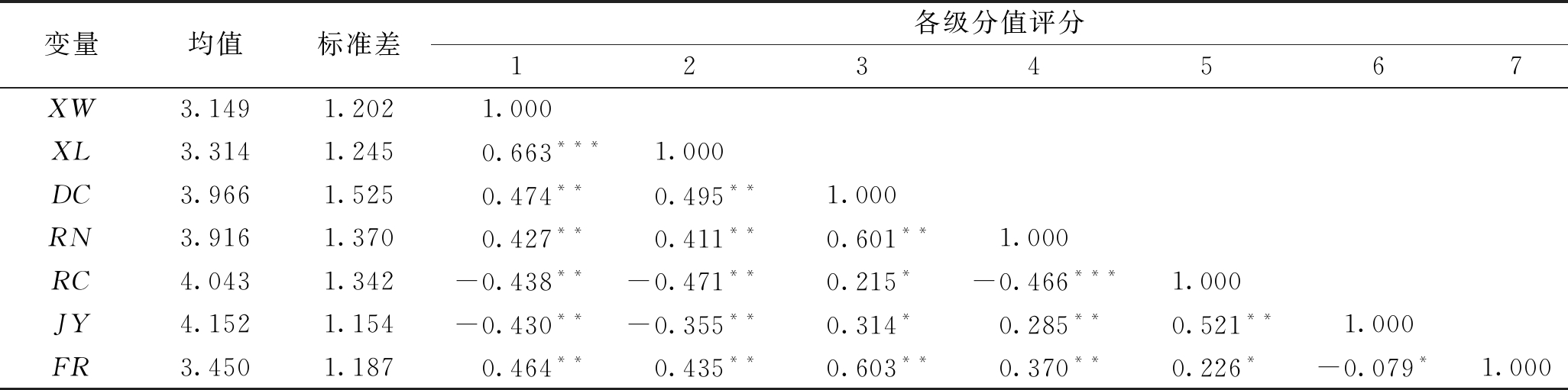 注:*表示显著性P<0.05,**表示P<0.01,***表示P<0.001。 变量均值标准差各级分值评分1234567XW3.1491.2021.000XL3.3141.2450.663***1.000DC3.9661.5250.474**0.495**1.000RN3.9161.3700.427**0.411**0.601**1.000RC4.0431.342-0.438**-0.471**0.215*-0.466***1.000JY4.1521.154-0.430**-0.355**0.314*0.285**0.521**1.000FR3.4501.1870.464**0.435**0.603**0.370**0.226*-0.079*1.000 由表1可以看出,矿工不安全心理与矿工不安全行为具有显著正向影响关系(线性相关系数r=0.663,显著性P<0.001),假设H3成立;在不同领导风格中,独裁型(r=0.474,P<0.01)、辱虐型(r=0.427,P<0.01)和放任型(r=0.464,P<0.01)领导风格与矿工不安全行为均具有显著正向影响关系,仁慈型(r=-0.438,P<0.01)和交易型(r=-0.430,P<0.01)领导风格与矿工不安全行为具有显著负向影响关系,假设H1成立;在不同领导风格中,独裁型(r=0.495,P<0.01)、辱虐型(r=0.411,P<0.01)和放任型(r=0.464,P<0.01)领导风格与矿工不安全心理具有显著正向影响关系,仁慈型(r=-0.471,P<0.01)和交易型(r=-0.355,P<0.01)领导风格与矿工不安全心理具有显著负向影响关系,假设H2成立。 4.2 矿工的不安全心理中介效用分析为了验证矿工不安全心理在安全管理者不同领导风格与矿工不安全行为中的中介作用,笔者采用AMOS22.0软件对不安全心理的中介效应进行检验,检验结果见表2,基于检验结果对中介效应进行了汇总,汇总结果见表3。 表2 AMOS中介检验结果