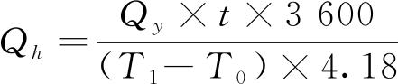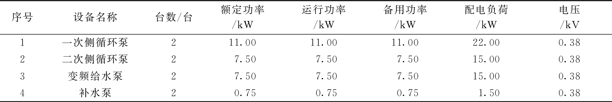图2 空压机余热利用系统流程 供热侧每台空压机余热回收机组并联安装,进出水口安装电动阀门,阀门的开启与空压机余热回收机组工作同步,工作时打开,停止时关闭,避免水路的无效循环。系统中水泵设计均为“一用一备”,便于循环检修和故障切换;洗浴热水换热器二次侧仅是对自来水进行加热,并不是软化水,因此需要定期检修清洗,为保证系统不间断供热,也为“一用一备”设计,并在备用期间进行检修清洗。 由于洗浴热水是自来水加热后供生活热水使用的,因此洗浴热水的水质也要符合生活用水的水质标准。但我国大部分地区的水质硬度较高,特别是自来水以地下水作为水源时,水质的不稳定性易造成设备管道的腐蚀和结垢。为防止二次蓄热循环系统的板式热器和管道内结垢,在水质较差地区,要在给水管道上加装食品级硅磷晶阻垢剂;在水质相对较好的地区,要加装电磁类阻垢装置以减缓设备管道结垢,延长保养清洗周期。为防止管道腐蚀,二次蓄热循环系统管道设计采用镀锌管或PPR热水管。在空压机余热回收机组和板式换热器之间闭式循环系统的主管道上加装超声波热量计,计量系统热回收量;在自来水补水管上加装水表,计量用水量,便于统计分析系统运行效果[7-10]。空压机余热回收洗浴热水制取系统总配电功率为53.50 kW,最大运行功率和备用功率均为26.75 kW,空压机余热回收系统配电负荷见表1。 表1 空压机余热回收系统配电负荷
