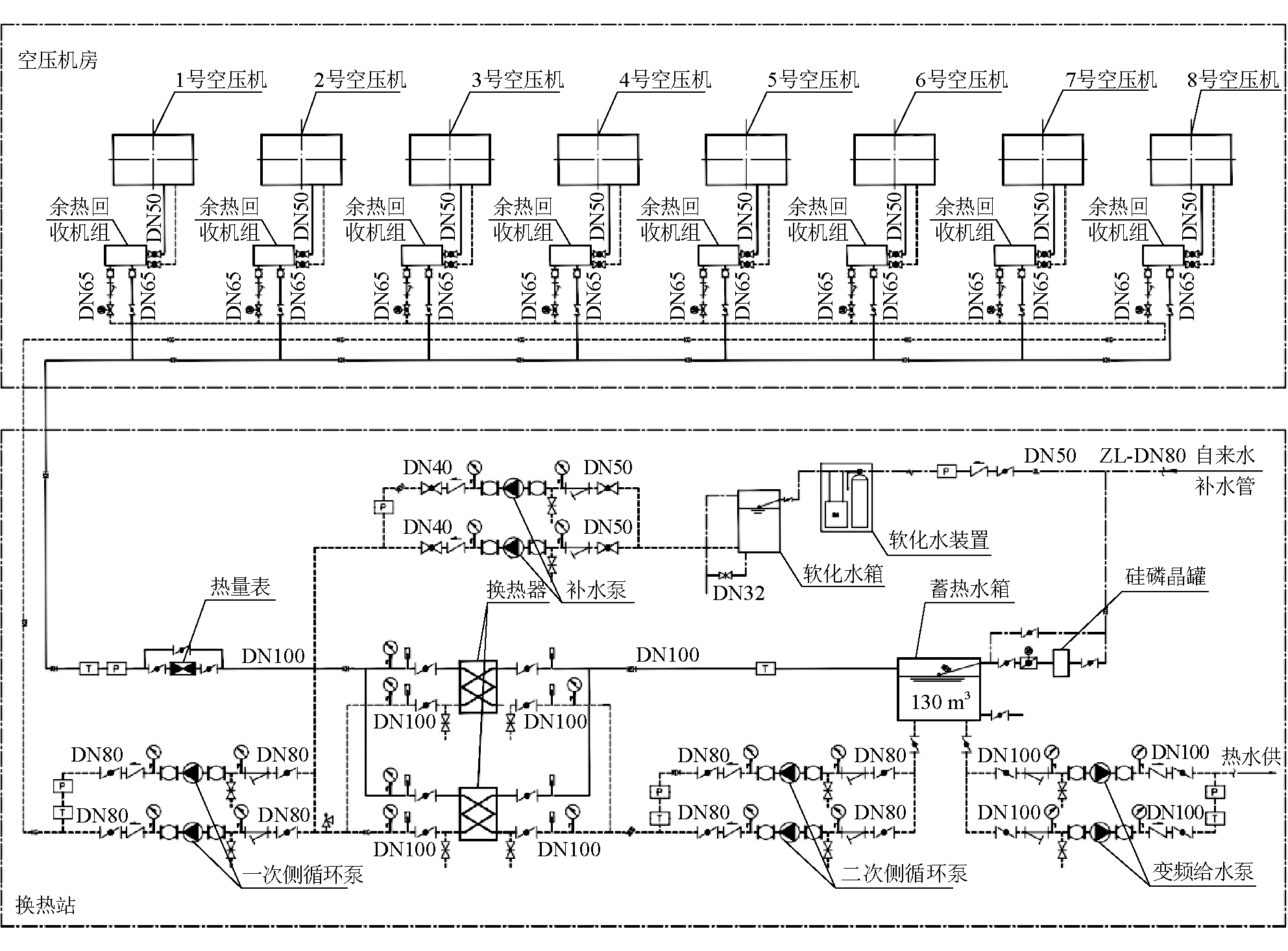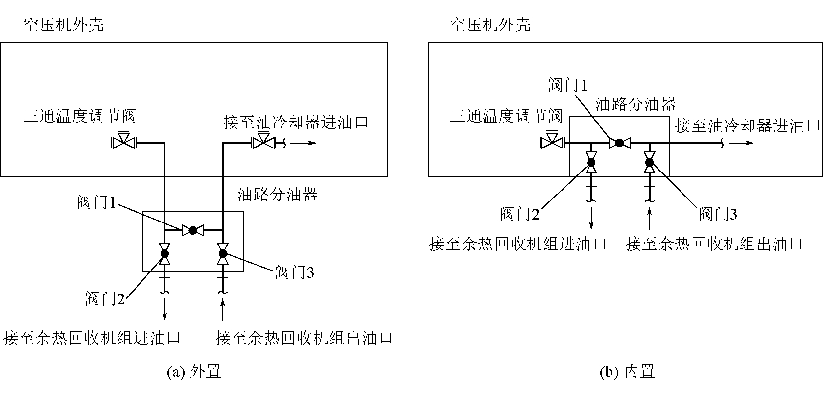 图1 空压机油路分离器安装示意 高压钢丝胶管接口一般有2种方式,一为法兰螺栓连接,二为丝接。当空压机润滑油管使用的是高压钢丝胶管时,则采用空压机油路分离器外置安装方式(图1(a)),油路分油器有3个阀门和4个接口,拆下三通温度调节阀至油冷却器调节阀一端的油管,将阀门1进口同三通温度调节阀连接,阀门2的出口接到余热回收机组的进油口,阀门3的进口接至余热回收机组的出油口,阀门1出口接空压机原油冷却器的油管。回收空压机余热时,关闭阀门1,打开阀门2和阀门3,润滑油经过余热回收机组回收余热后再流回空压机原冷却循环系统。如余热回收系统停用,则打开阀门1,关闭阀门2和阀门3,断开余热回收系统,切换回空压机原润滑油冷却系统。 当空压机使用钢制油管时,则进行空压机机壳内部油路分油改造,即油路分油器内置安装方式(图1(b)),根据空压机内部空间结构,在三通温度调节阀至油冷却器的油管上便于改造安装和后期维护的位置,断开油管,安装阀门1,在阀门1两端开口接入阀门2和阀门3。在空压机内部改造时,要对新加入的油路分油器或阀门做好支撑和固定,避免机器运行时的震动对空压机造成损伤,在润滑油路上加装的阀门设计采用1.6 MPa不锈钢法兰球阀,方便安装和检修,因为润滑油渗透性强,采用法兰螺栓连接,紧固压力大,便于止漏。 3.3 热水系统设计每台空压机设计1台空压机余热回收机组,取热时将空压机油冷却系统改造后引出的油管接至余热回收机组对应的油路接口上。供热侧设置一次侧循环泵,通过管道连接空压机余热回收机组和洗浴热水换热器热媒侧,加注软化水,构成闭式中间循环系统;设置二次侧循环泵,通过管道连接洗浴热水换热器供热侧和蓄热水箱,组成开放式(常压)蓄热系统;系统设计变频给水泵,把蓄热水箱中的热水送到职工浴室或其他用水单位。空压机余热利用系统流程如图2所示。