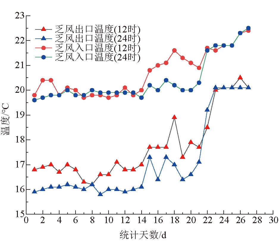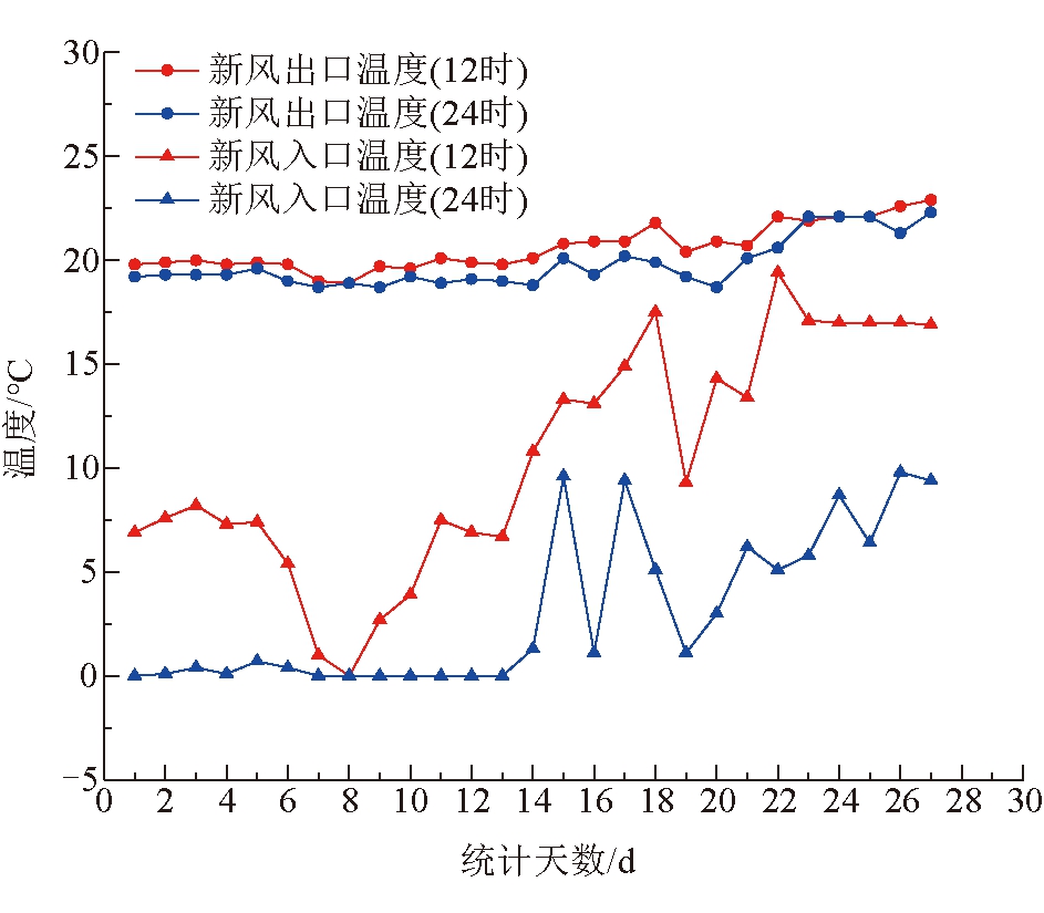 图5 新风入口-出口温度曲线 由图4和图5可以看出,随着冬季白天气温回升,乏风出入口温度、新风出入口温度随之升高,且午时温度均高于凌晨温度。井下乏风在通过风道进入换热器后,将热能通过换热器交换给了同样到达换热器的新风,使新风温度升高,送向井口实现井口保温防冻效果。乏风通过换热器后,温度平均降低了5 ℃;新风通过逆流直换技术被加热,寒冷天气升温效果显著,可达20 ℃。