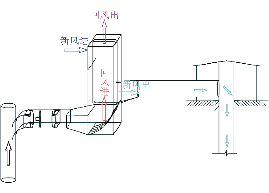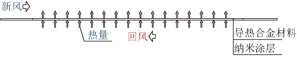 热需求热负荷/kW余热资源余热量/kW井筒防冻1 390.40矿乏回风4 613.10洗浴热水174.40压风机180.63 2 技术原理2.1 逆流直接换热技术井筒防冻技术方案主要是利用逆流直接换热技术,矿井乏风通过风道进入布置有高效导热纳米金属合金材料的热量直接换热器,与逆流进入换热器的新风进行高效热交换,以实现用矿井余热加热新风的目标。加热后的新风被风道导入至井口处,实现井口防冻的效果,逆流间壁式换热技术原理如图1所示。