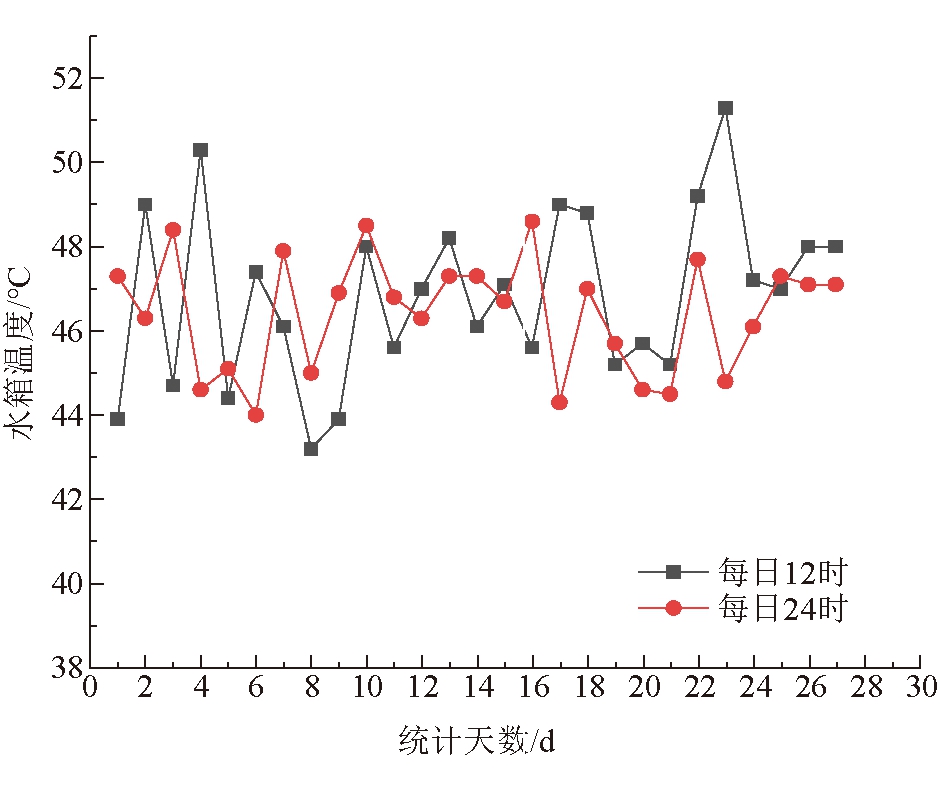图3 空压机余热换热技术原理 空压机余热技术换热方式为压缩机油-中间循环水-洗浴热水,通过中间循环水与85 ℃的压缩机油换热,吸收压缩机油的热量后进入热水箱下部的加热器,制取45~50 ℃热水用于洗浴热水加热。中间循环水水质的控制对系统内换热效果有直接影响,控制好循环水水质,定期清理水箱下部换热器,效率无衰减。空压机热回收技术优点是运行成本极低,热水温度保证较高,加热无运转部件,使用寿命长。 3 项目运行效果分析安阳煤矿余热综合利用项目自2022年1月正式投入运行以来换热效果显著,该项目可以稳定满足井口房混风温度不低于2 ℃的要求,还可以满足厂区职工的洗浴需求。笔者选取了2022年2-3月30 d的井下乏风和新风每日12时和24时入口-出口的温度数据,乏风入口-出口温度曲线如图4所示,新风入口-出口温度曲线如图5所示,井口温度曲线如图6所示,洗浴水温度曲线如图7所示。